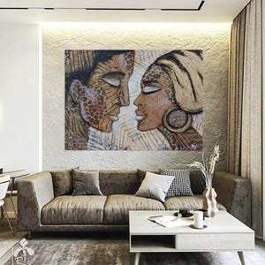 Abstract African Girls is an original hand painted oil and acrylic painting on natural canvas with high quality oil and acrylic paints in a sophisticated mixed media. Abstract Girls is a very stylish, elegant textured painting, painted in classic black and white with bold accents. Luxurious combination of colors makes this picture especially attractive. Such a picture will perfectly decorate your interior, make it even more elegant and comfortable. At your request, the artist can make any adjustments to the drawing, change the color, add or remove any details. You can order any size that suits your interior. We will gladly fulfill all your wishes! Let's paint a new picture together! Also, this picture will be a great gift for family and friends on any significant date, talking about your feelings.