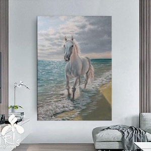 A beautiful light horse is a modern, abstract, stylish, original, textured, bright handmade painting, painted on natural canvas with high-quality oil and acrylic paints. The classic combination of black and beige, a bit of contrasting black and a beautiful image of an abstract horse portrait will make this picture a stylish and exclusive decoration of your interior. The velvety texture of this picture perfectly emphasizes the plot.