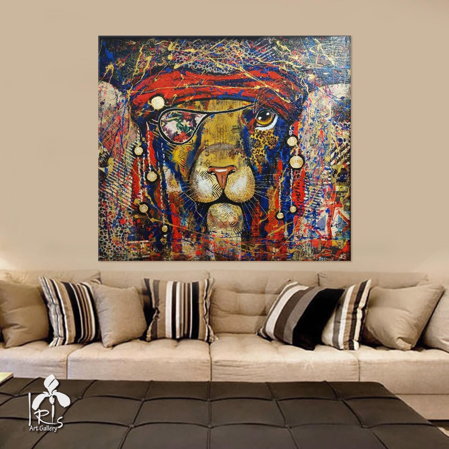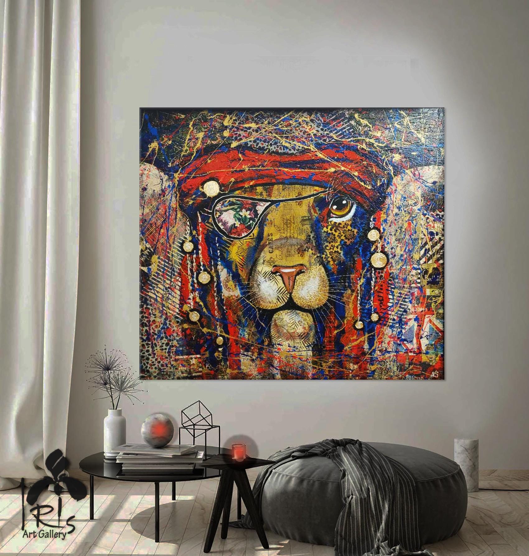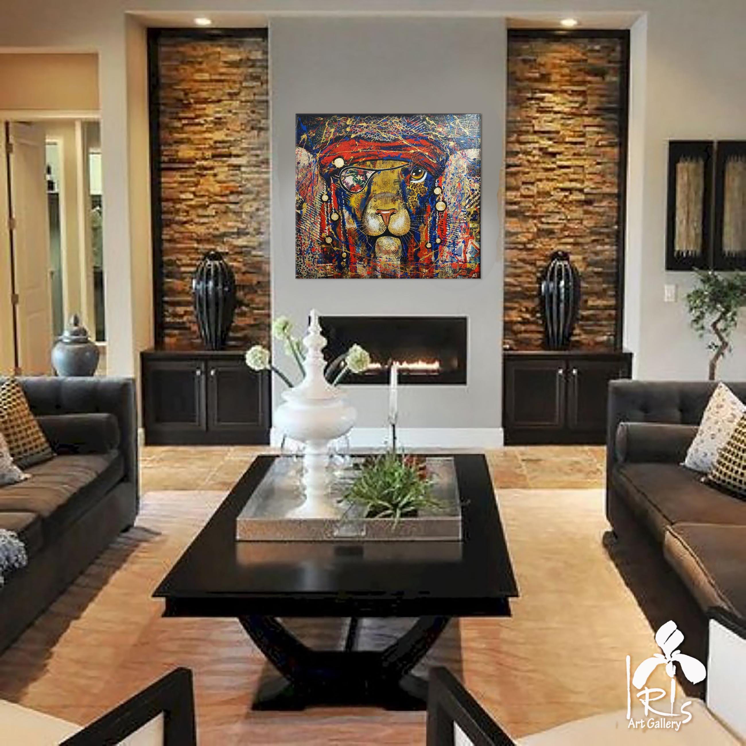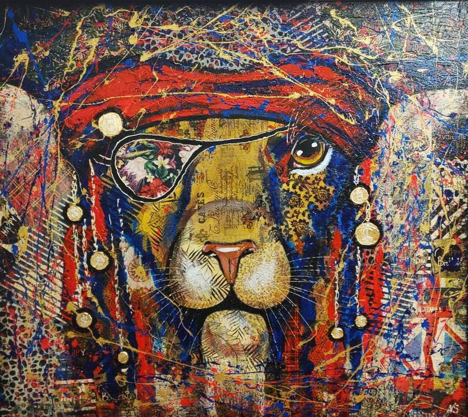 Abstract pirate lion - bright, modern, abstract, very stylish, original, hand-painted on natural canvas with high-quality oil and acrylic paints. Painted in collage style. The combination of bright colors of blue, turquoise, gold, red and an abstract image of a pirate lion makes this picture a stylish, exclusive decoration for your interior. The complex, spectacular texture of this picture perfectly emphasizes the original plot of the abstract lion. The lion is the protector of your home. It will perfectly decorate your interior, bring positive energy and joy.