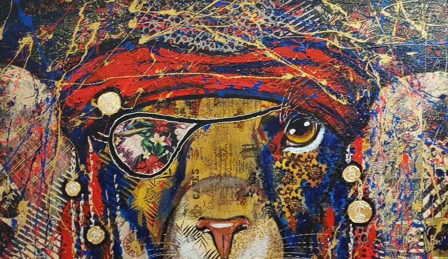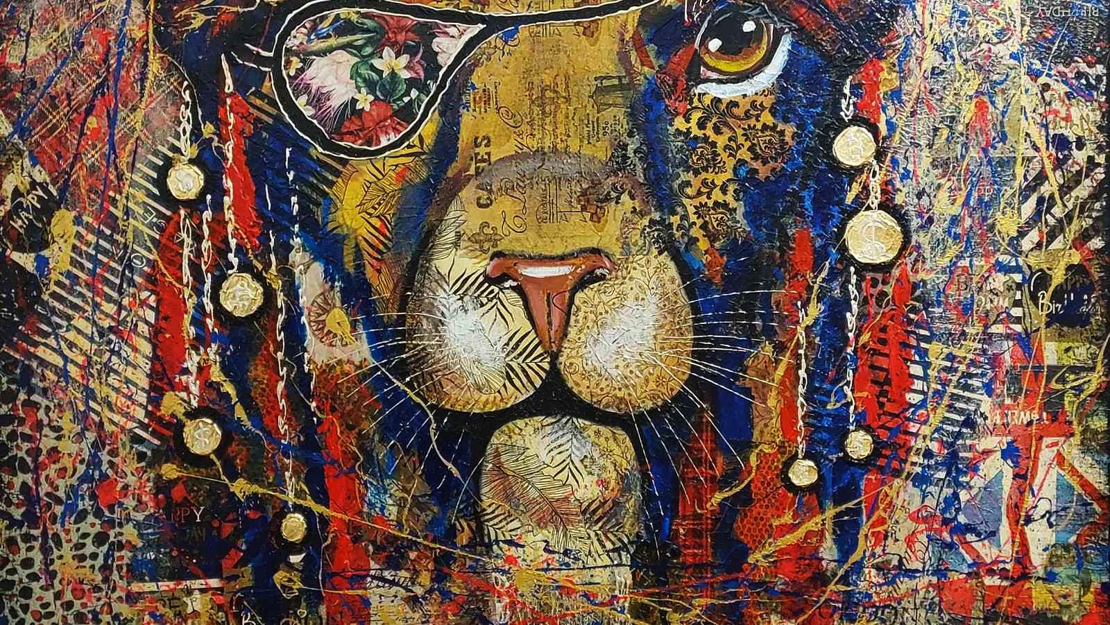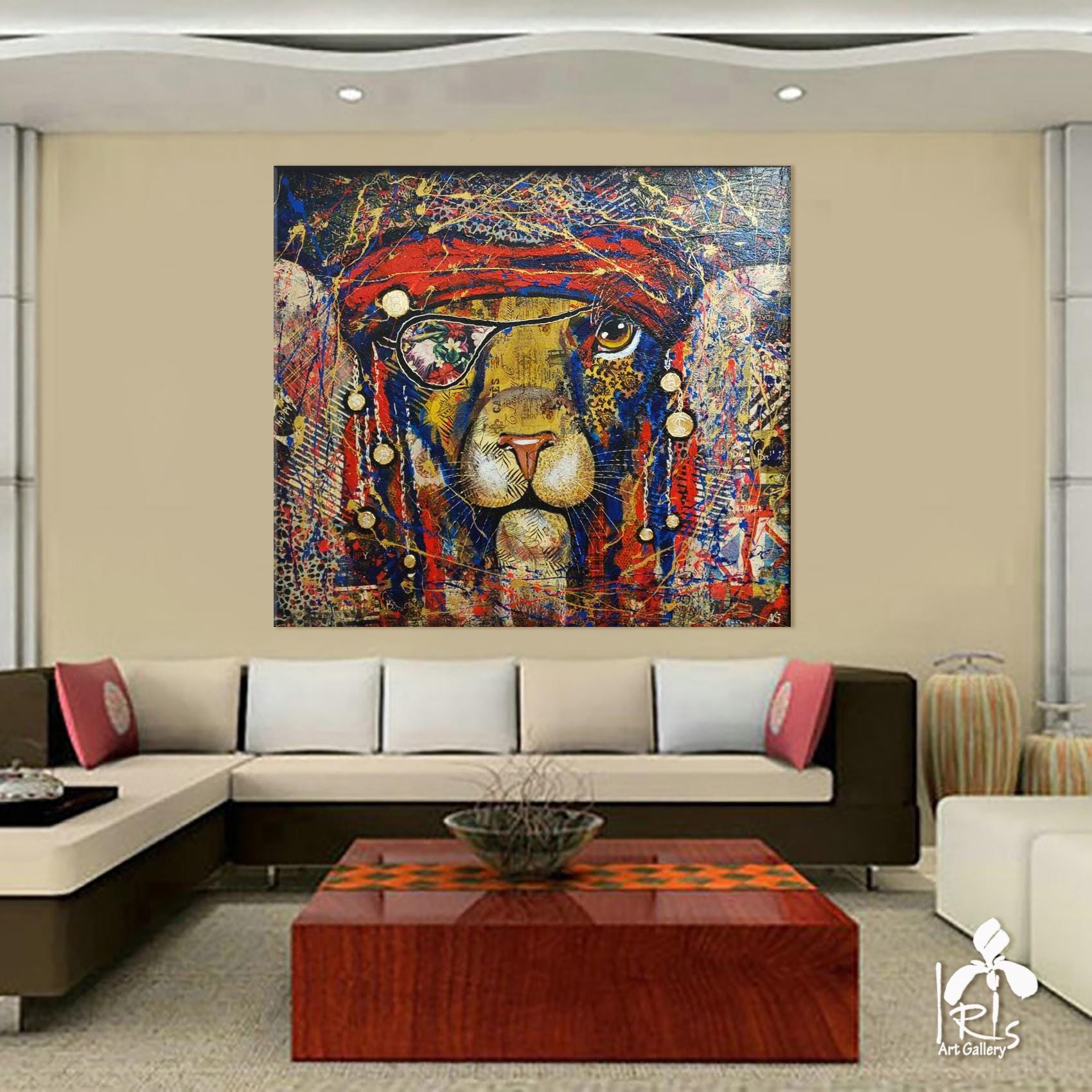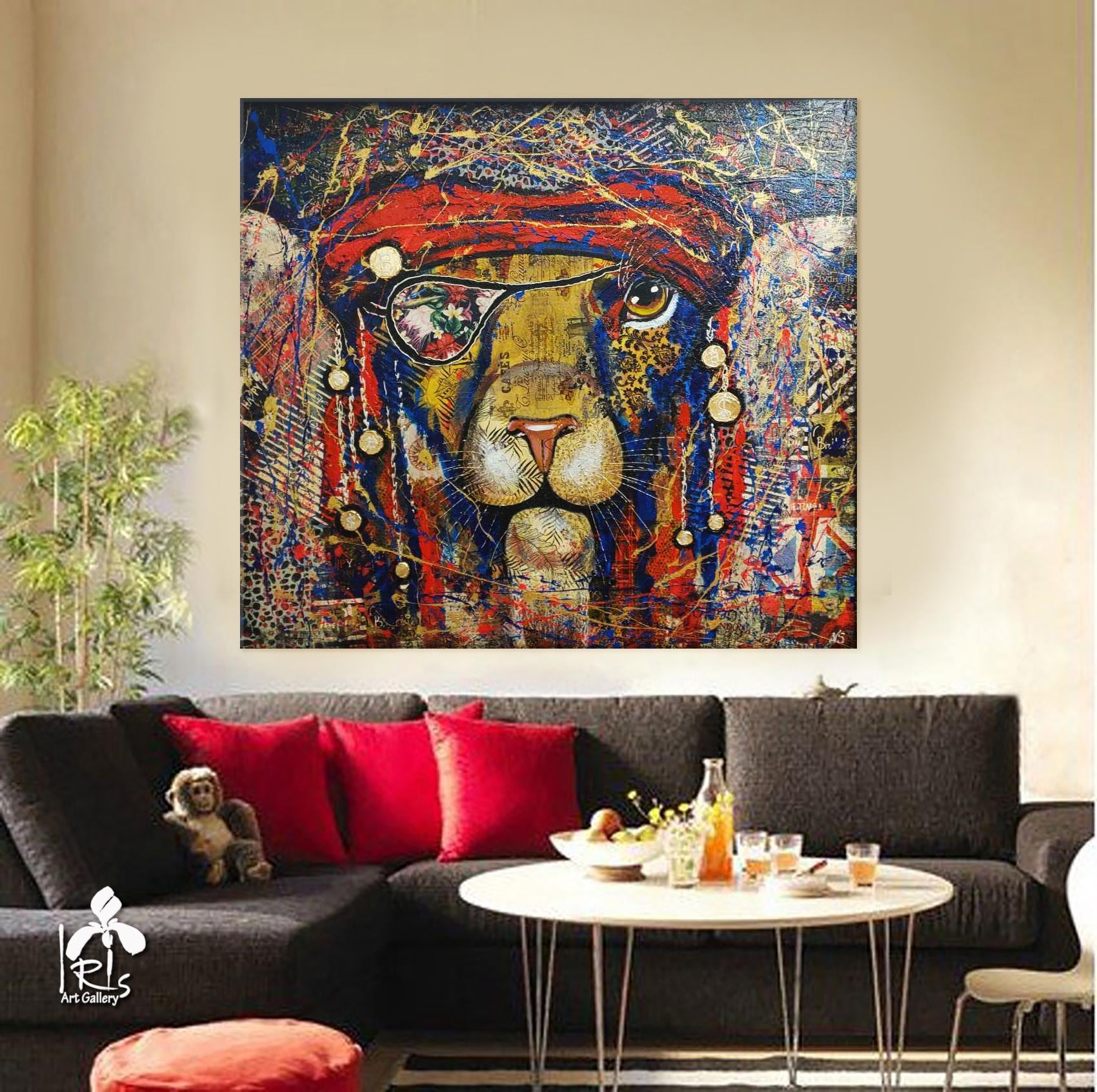 Abstract pirate lion - bright, modern, abstract, very stylish, original, hand-painted on natural canvas with high-quality oil and acrylic paints. Painted in collage style. The combination of bright colors of blue, turquoise, gold, red and an abstract image of a pirate lion makes this picture a stylish, exclusive decoration for your interior. The complex, spectacular texture of this picture perfectly emphasizes the original plot of the abstract lion. The lion is the protector of your home. It will perfectly decorate your interior, bring positive energy and joy.