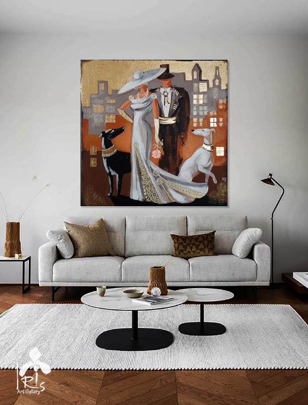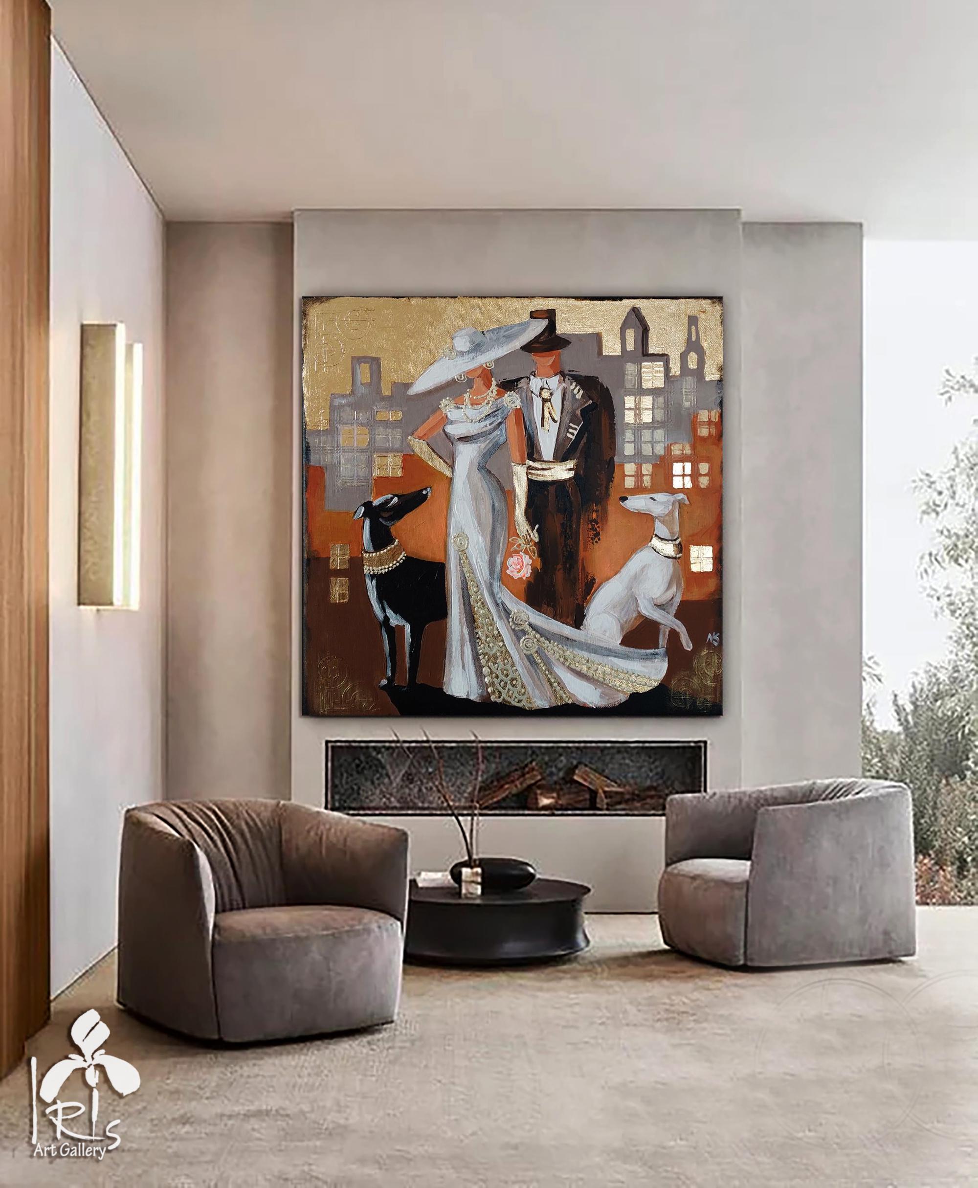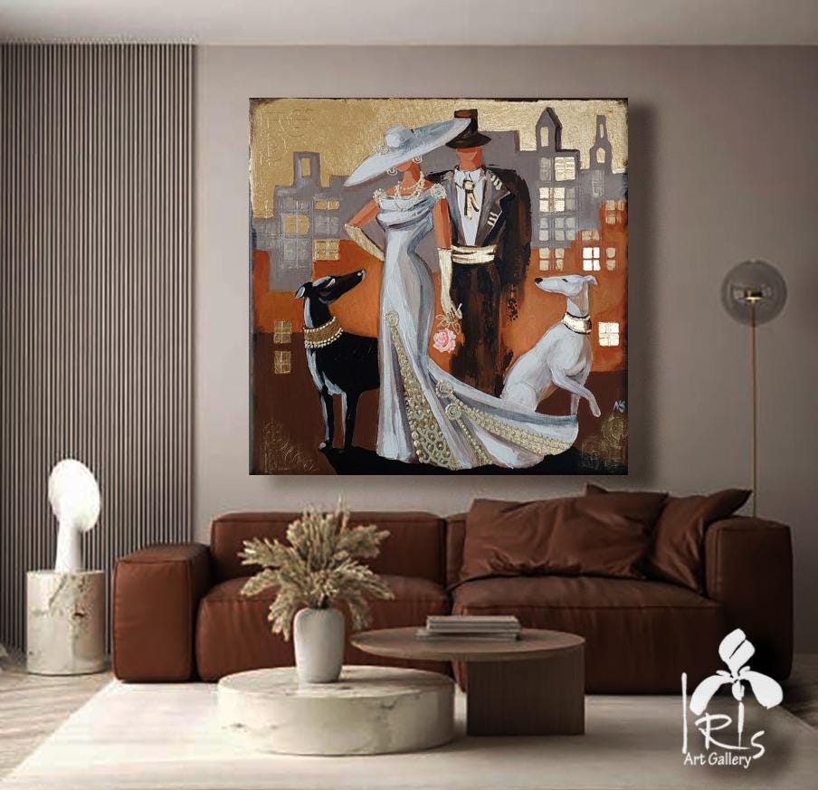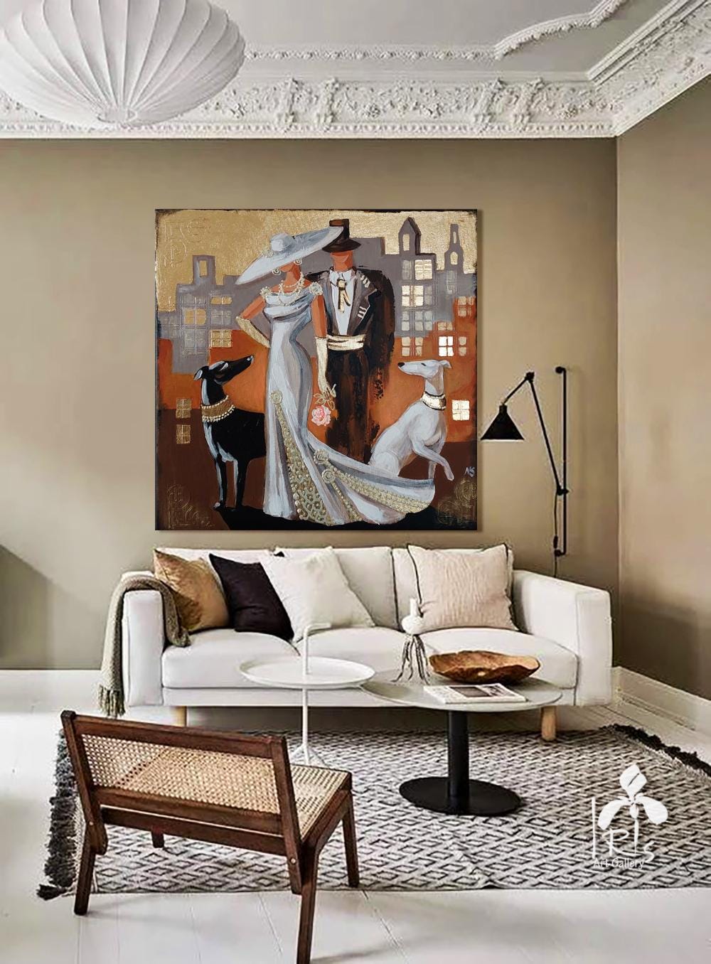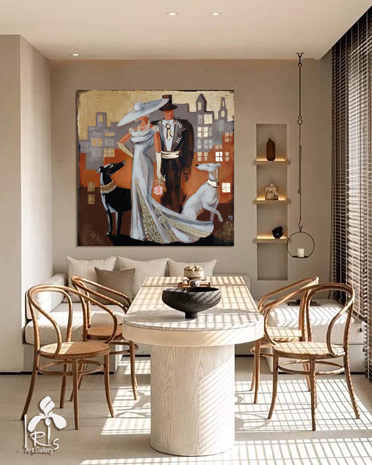 This abstract cityscape with people in love and dogs is an original, light, delicate, abstract, and very stylish painting, hand-painted on natural canvas using high-quality oil, acrylic, and gold leaf. This very beautiful painting in noble classic black, beige, and white tones with gold leaf will not leave you indifferent. The subject of the painting is beautiful abstract people and dogs. Life, lines, and shapes merging against a complex textured background symbolize the joy of life. The original, intricate texture of this painting perfectly complements the subject matter, making it even more appealing. This painting will perfectly complement your interior. It will make your home even more elegant and cozy. You can order a painting of any size, which will be the highlight of your interior. The painting is executed in a minimalist abstract style.