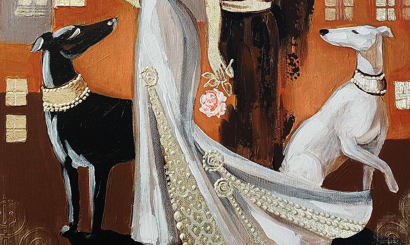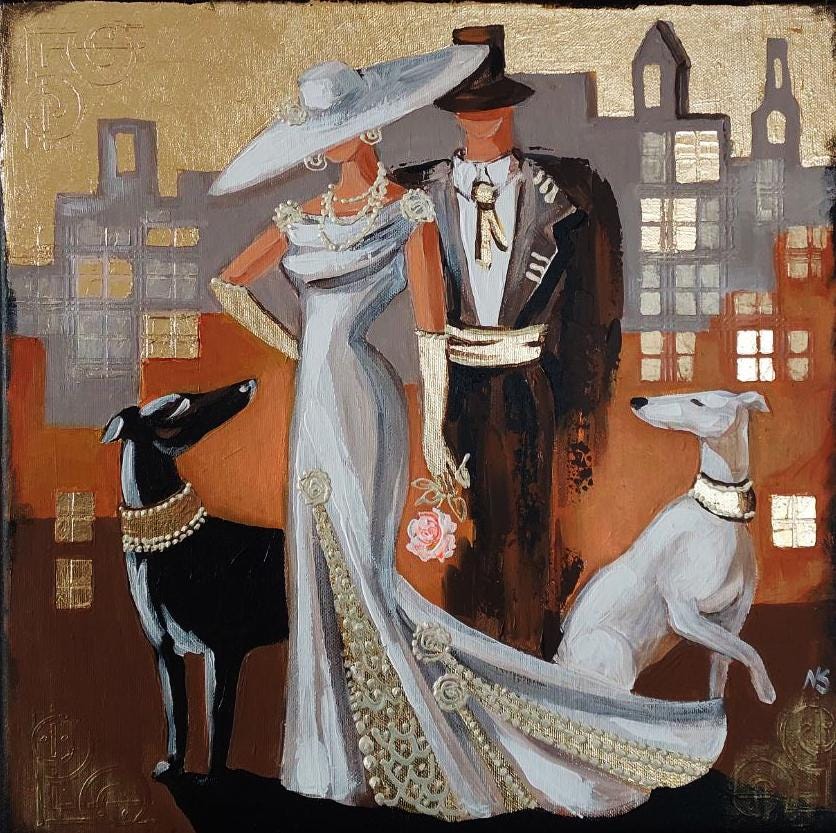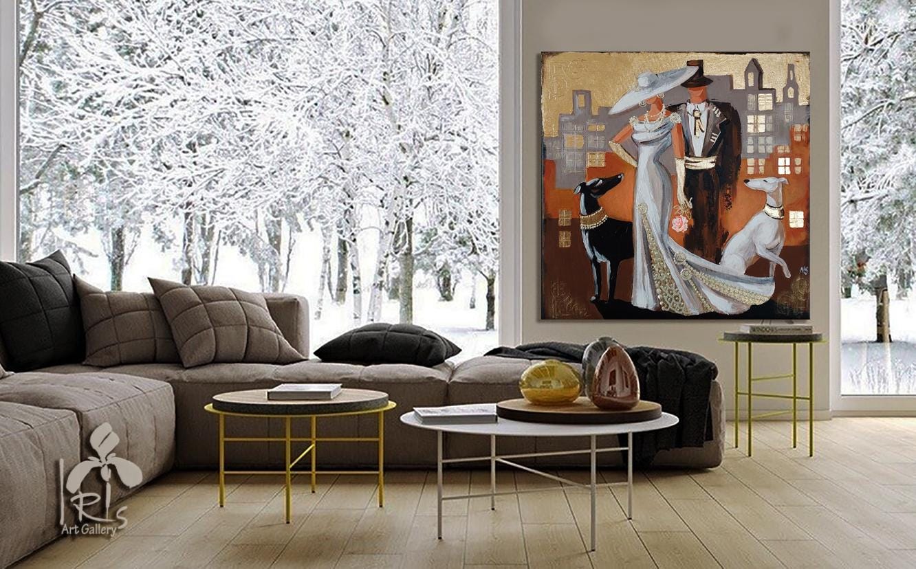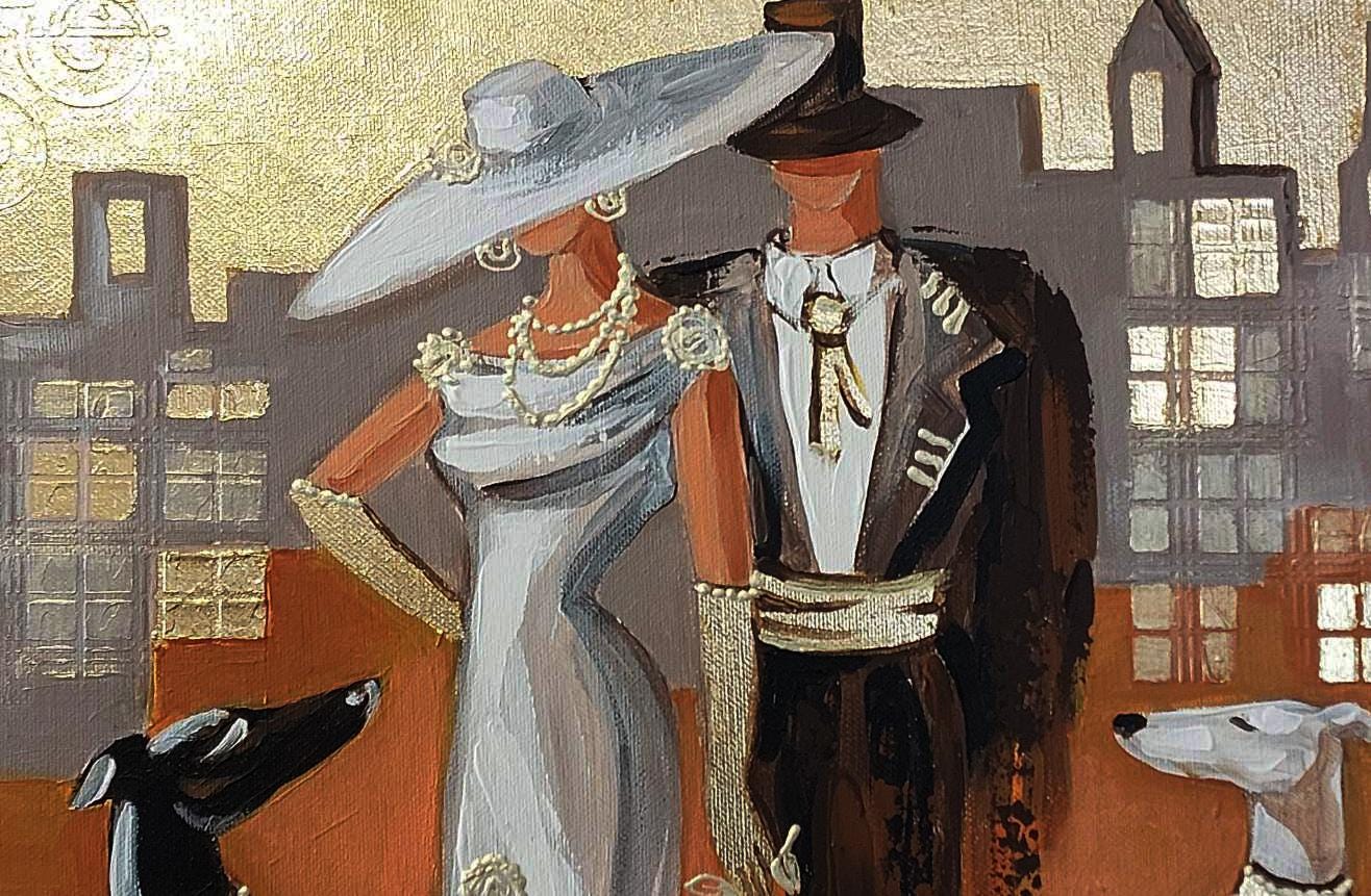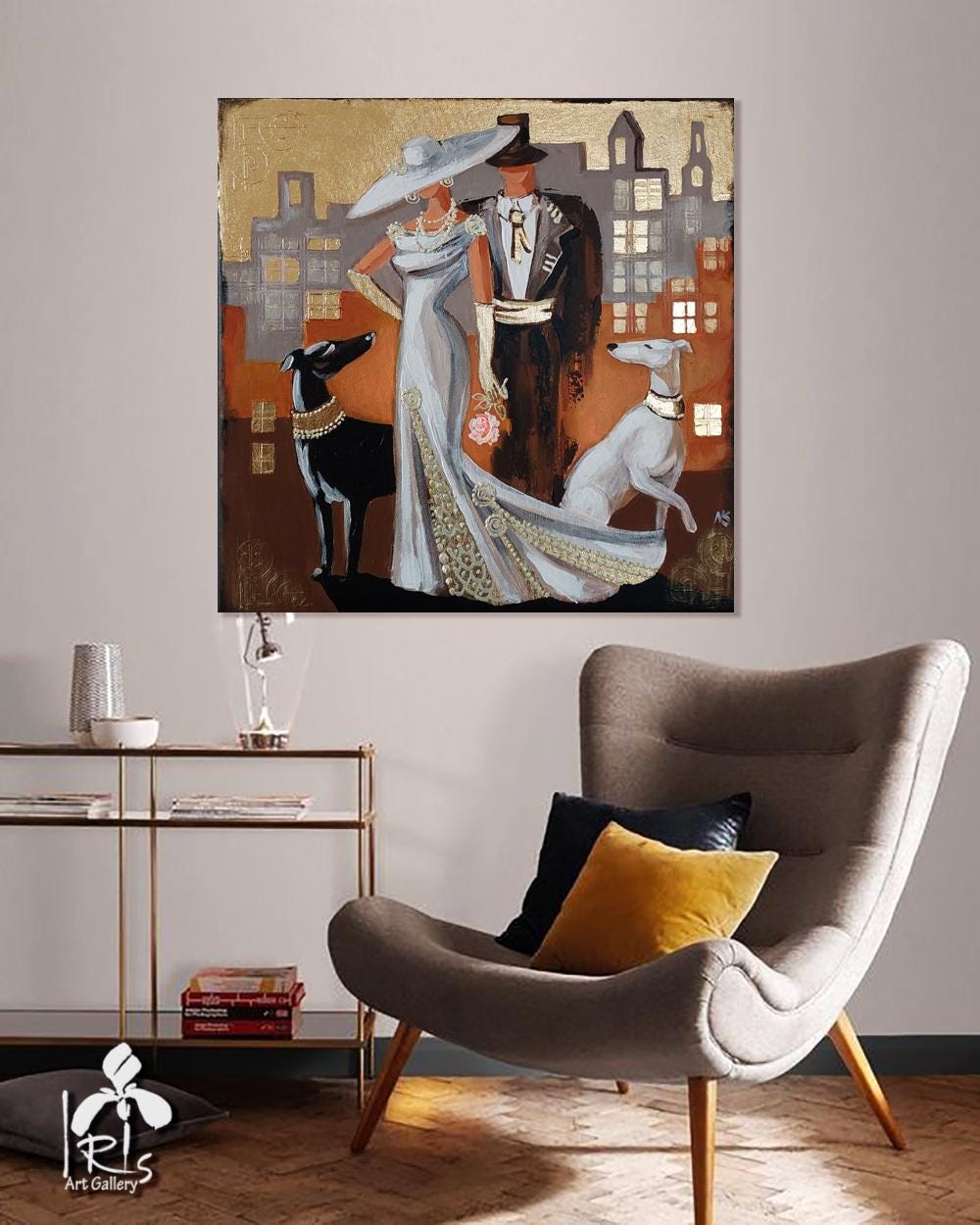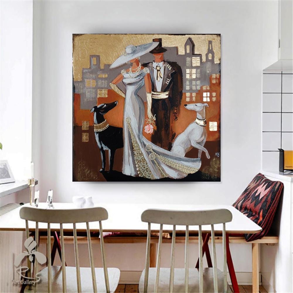 This abstract cityscape with people in love and dogs is an original, light, delicate, abstract, and very stylish painting, hand-painted on natural canvas using high-quality oil, acrylic, and gold leaf. This very beautiful painting in noble classic black, beige, and white tones with gold leaf will not leave you indifferent. The subject of the painting is beautiful abstract people and dogs. Life, lines, and shapes merging against a complex textured background symbolize the joy of life. The original, intricate texture of this painting perfectly complements the subject matter, making it even more appealing. This painting will perfectly complement your interior. It will make your home even more elegant and cozy. You can order a painting of any size, which will be the highlight of your interior. The painting is executed in a minimalist abstract style.