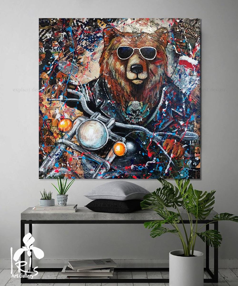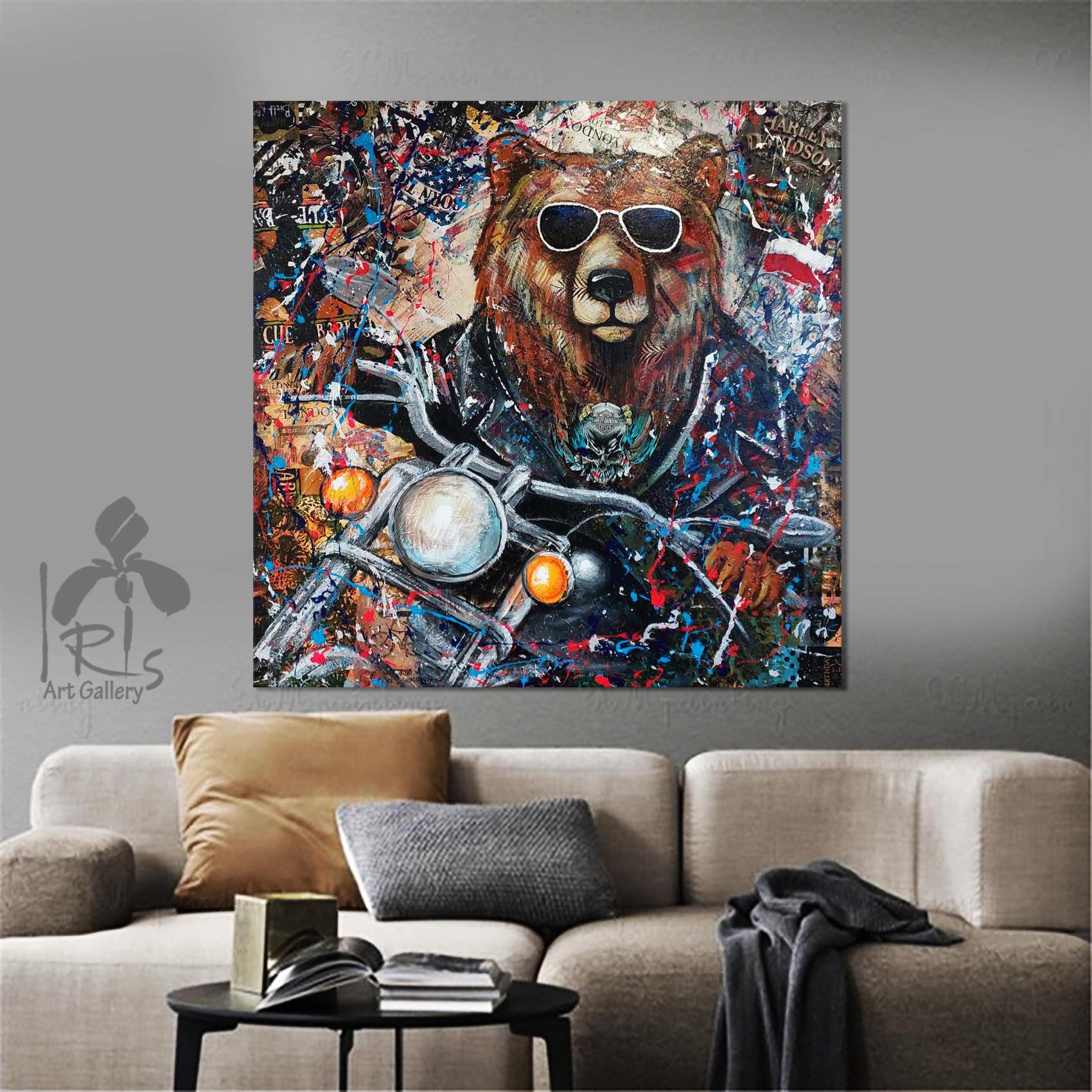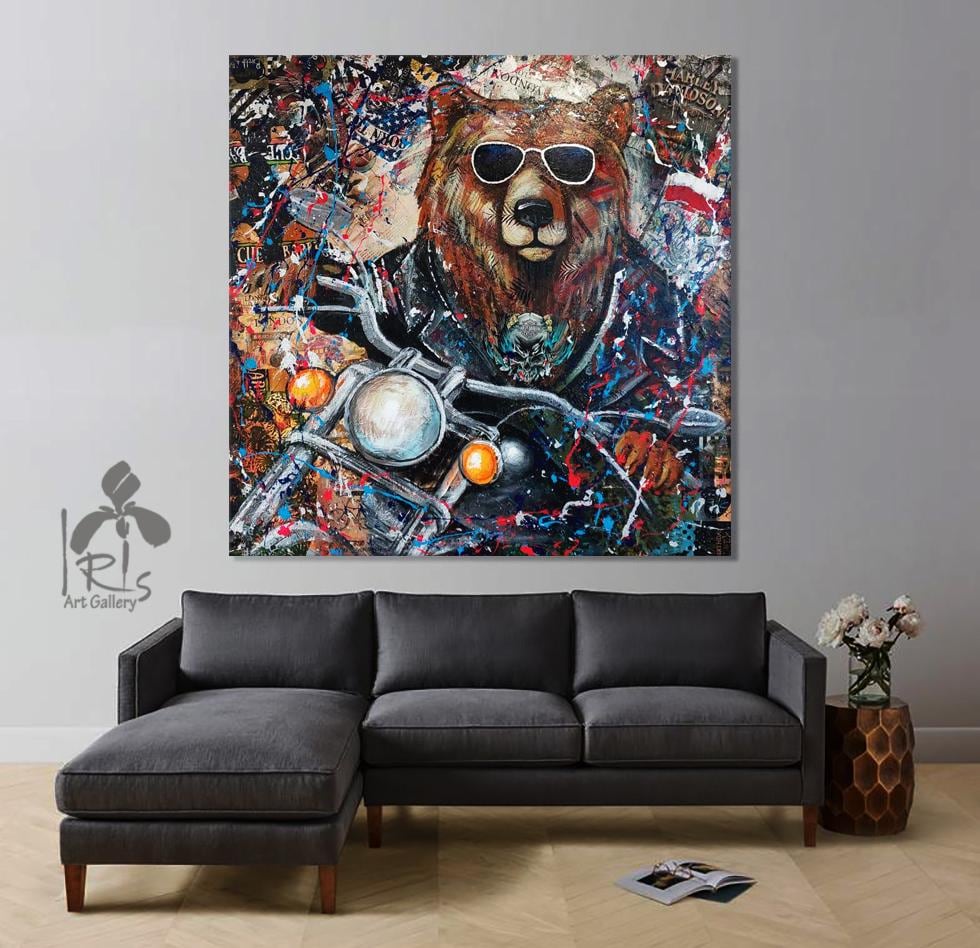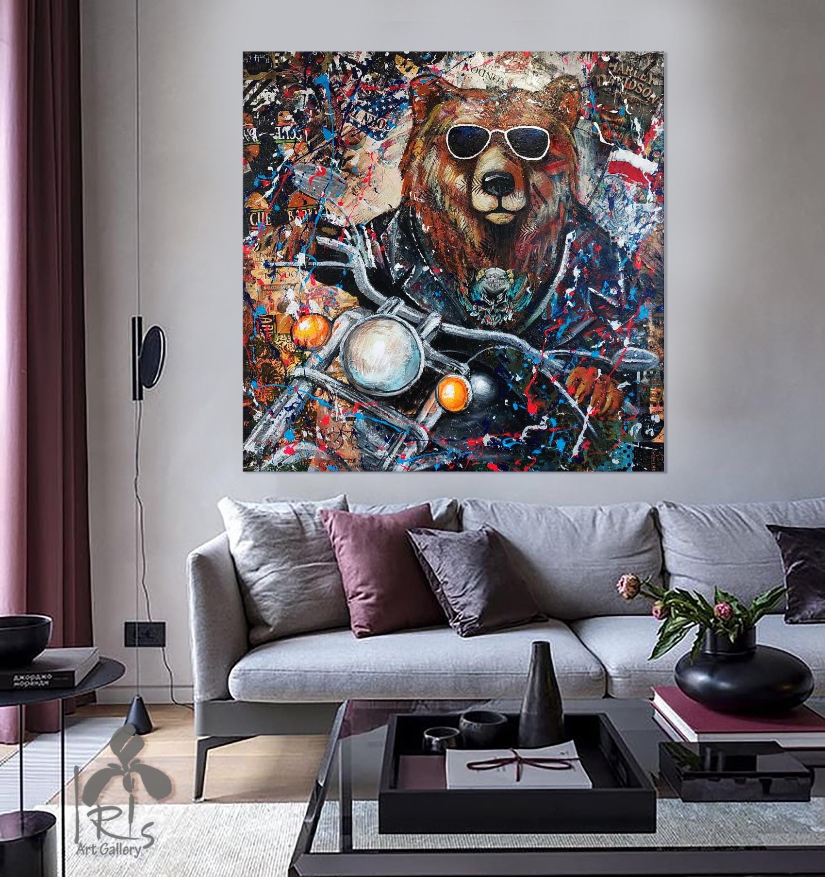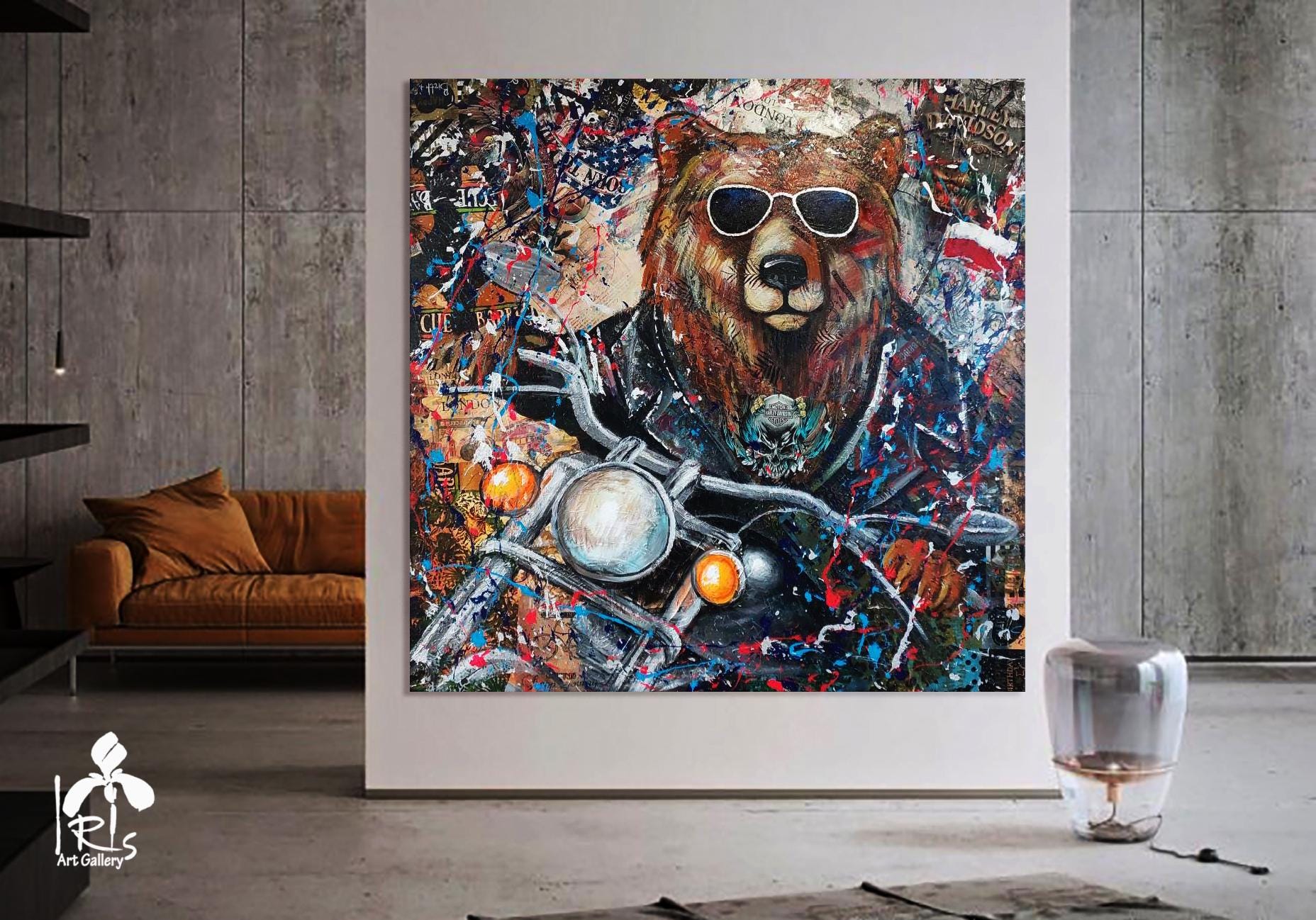 "Biker Bear" is a custom painting, created using an original collage technique on natural canvas with oil and acrylic paints. This abstract painting will perfectly decorate your interior. Life, lines, and shapes, merging against a complex textured background, symbolize the joy of life. The original, intricate texture of this painting fits perfectly with the subject matter, making it even more appealing. This painting will make your home even more elegant and cozy. You can order a painting of any size, which will become the highlight of your interior. The painting is executed in an abstract style.