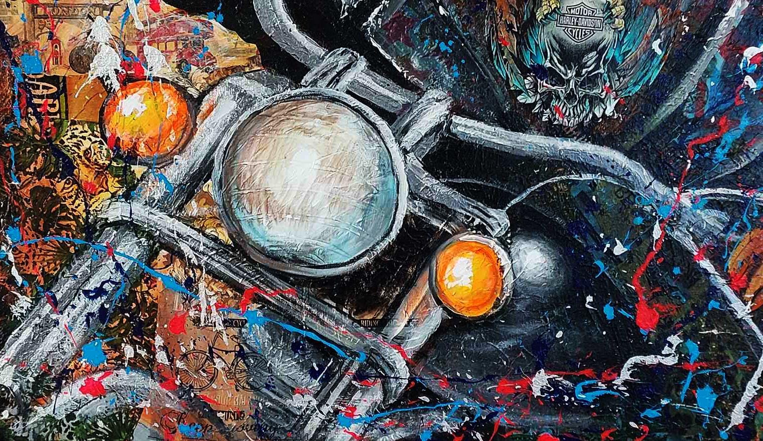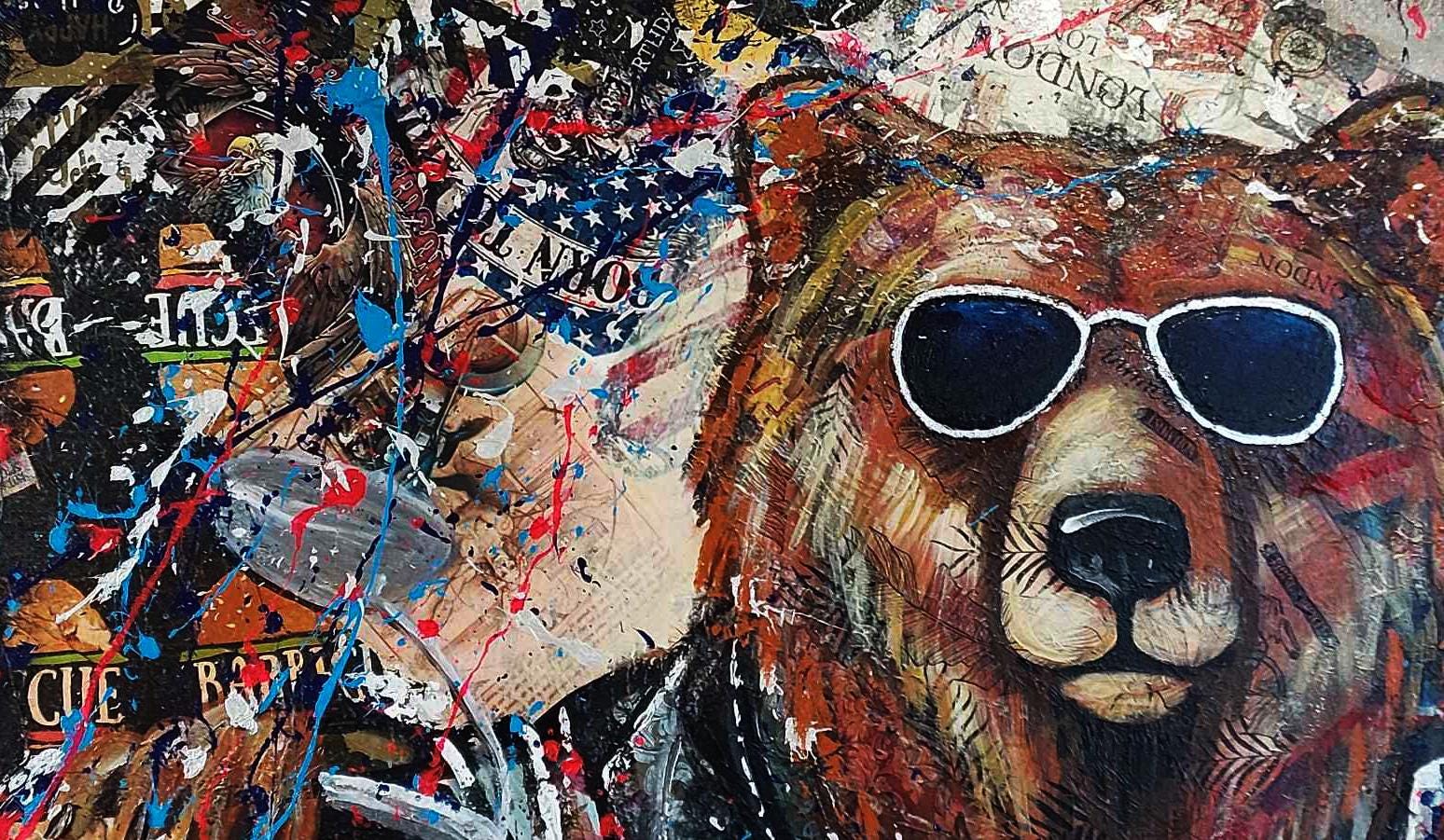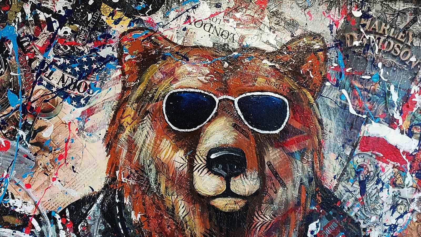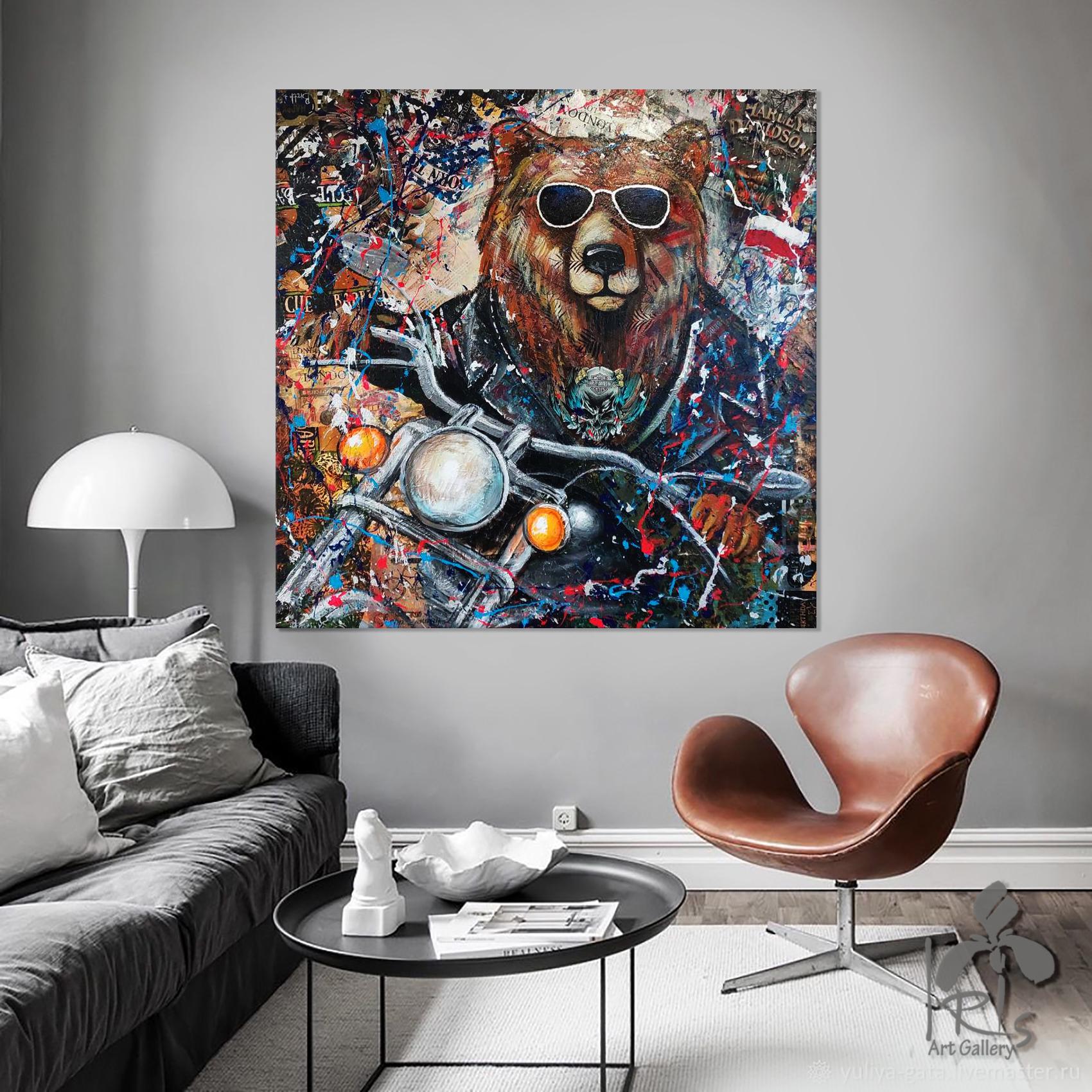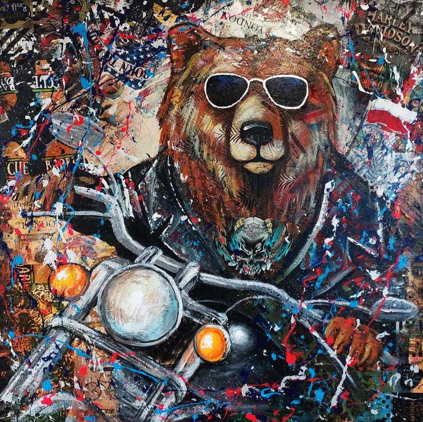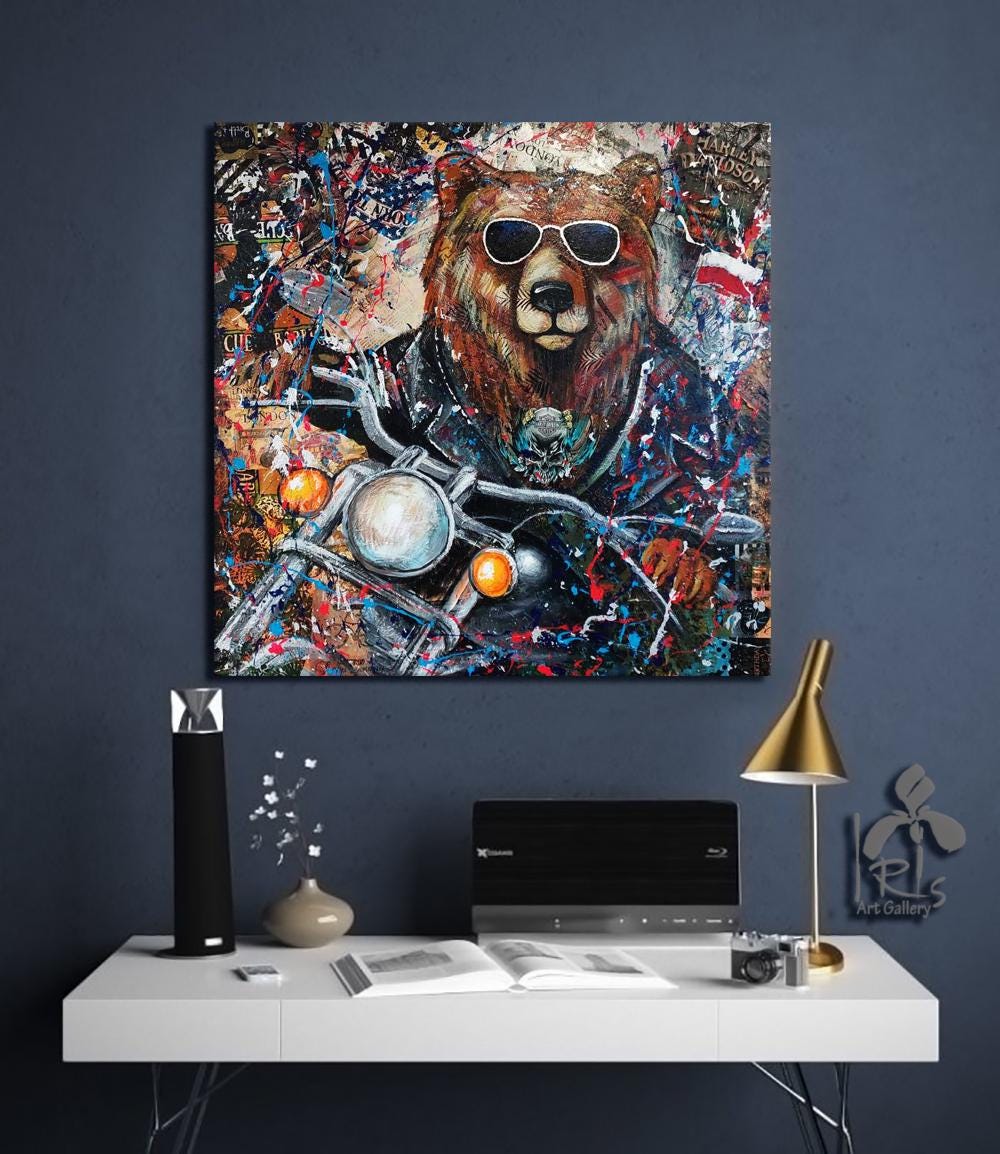 "Biker Bear" is a custom painting, created using an original collage technique on natural canvas with oil and acrylic paints. This abstract painting will perfectly decorate your interior. Life, lines, and shapes, merging against a complex textured background, symbolize the joy of life. The original, intricate texture of this painting fits perfectly with the subject matter, making it even more appealing. This painting will make your home even more elegant and cozy. You can order a painting of any size, which will become the highlight of your interior. The painting is executed in an abstract style.