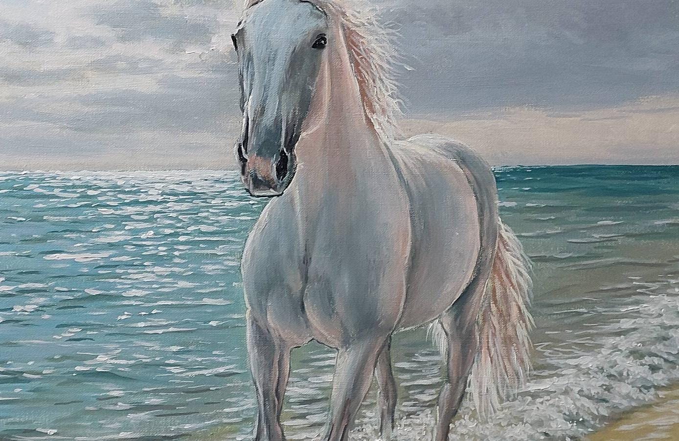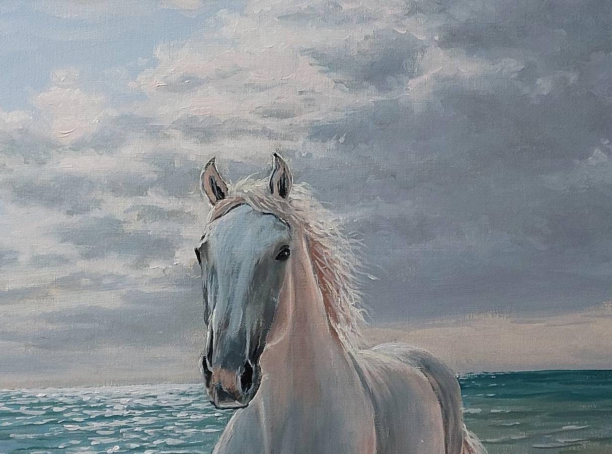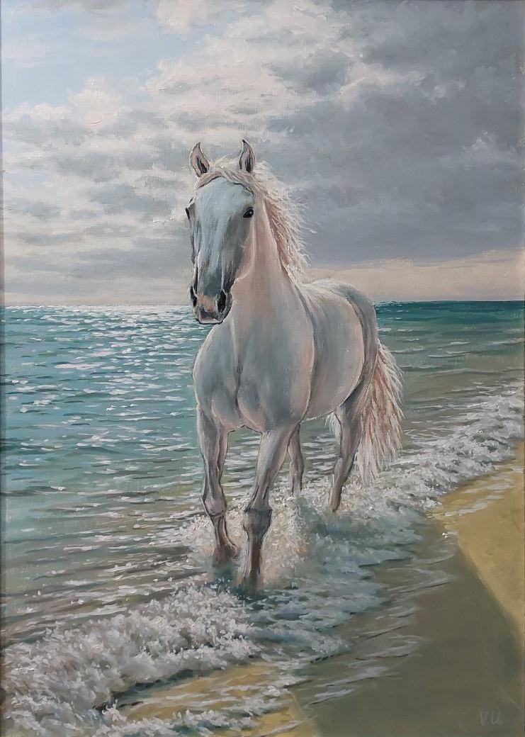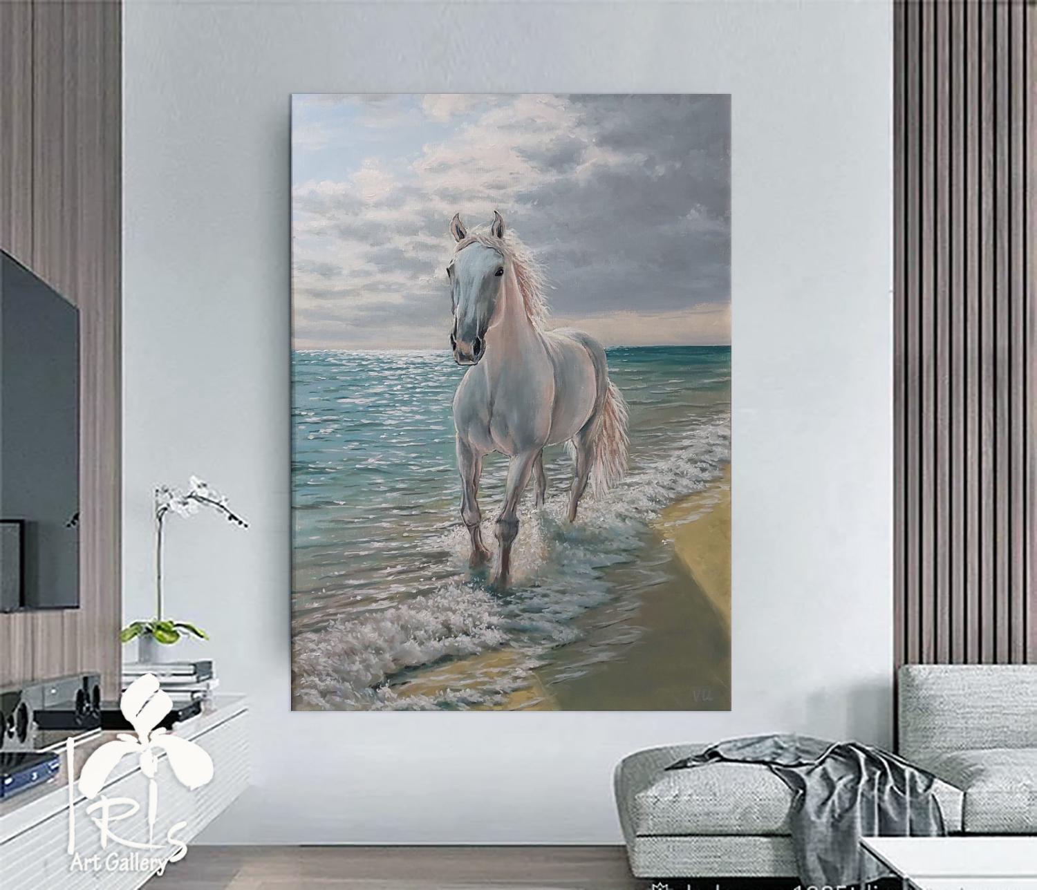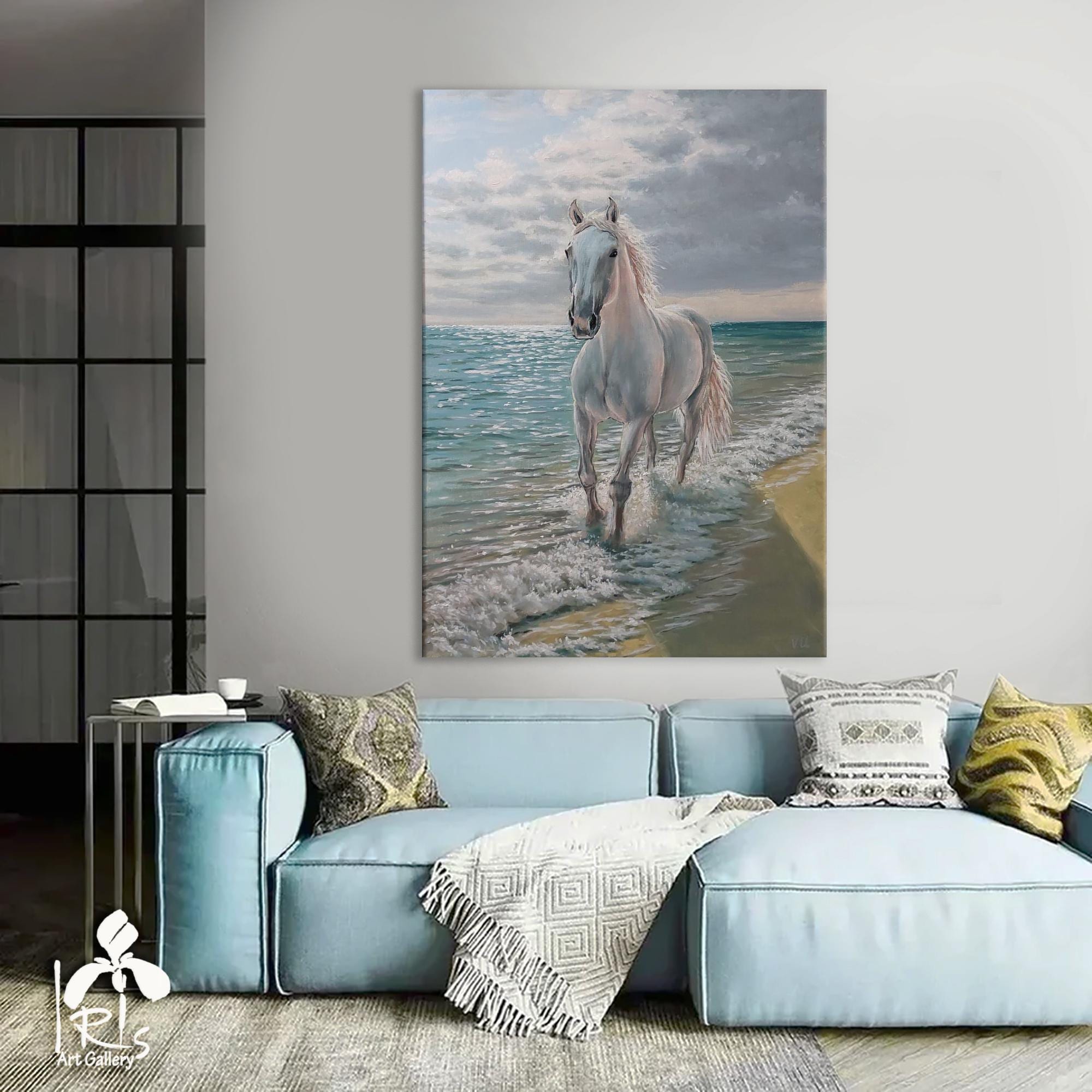 "Running White Horse by the Sea" is a modern, realistic, stylish, original, and exquisitely delicate handmade painting, painted on natural canvas with high-quality oil and acrylic paints. The classic combination of turquoise, beige, and white colors and the beautiful image of a running horse will make this painting a stylish, exclusive addition to your interior. Perfect for a living room, bedroom, dining room, or hallway, this painting will also make a wonderful gift for your family and friends for any occasion.