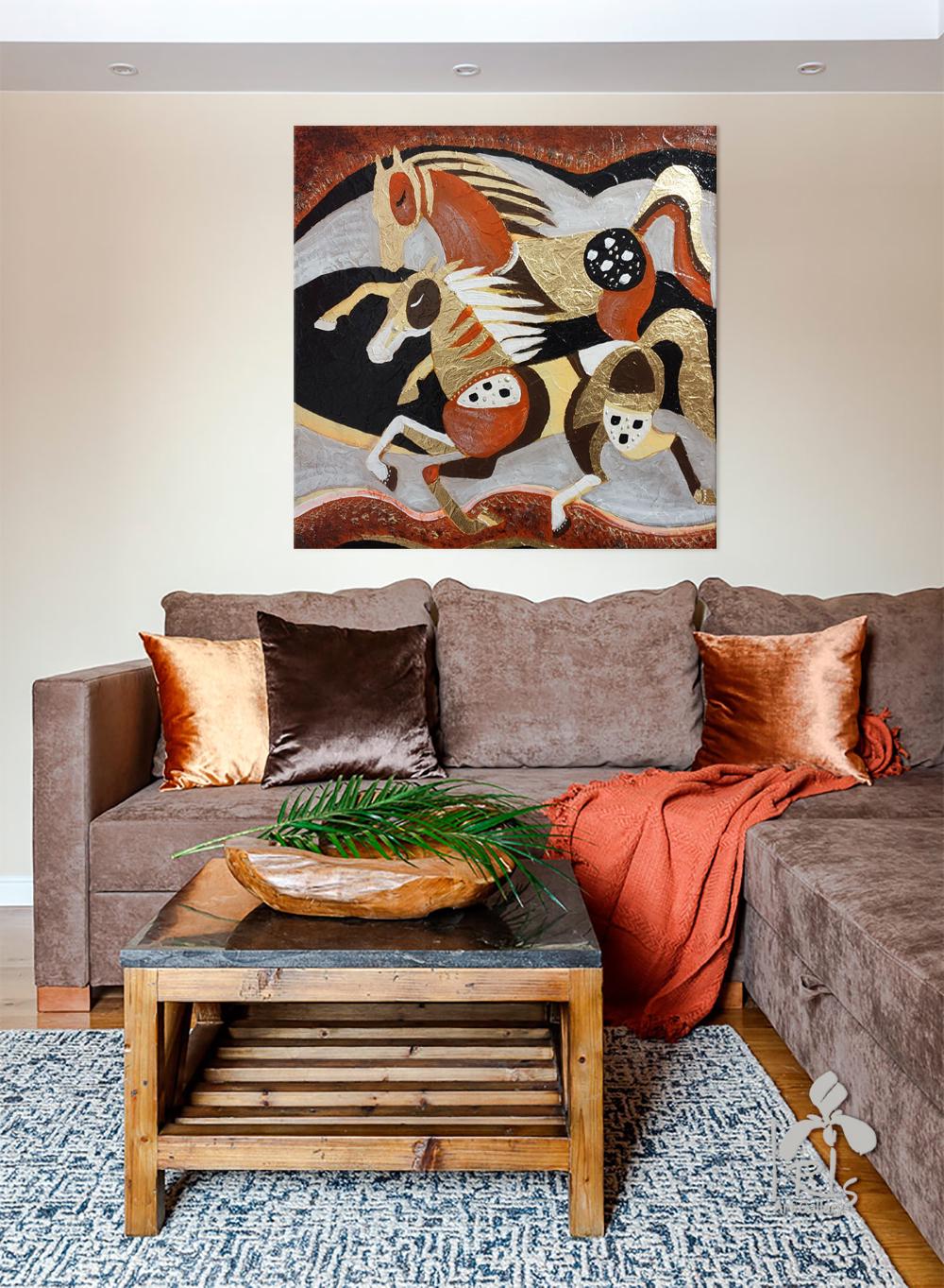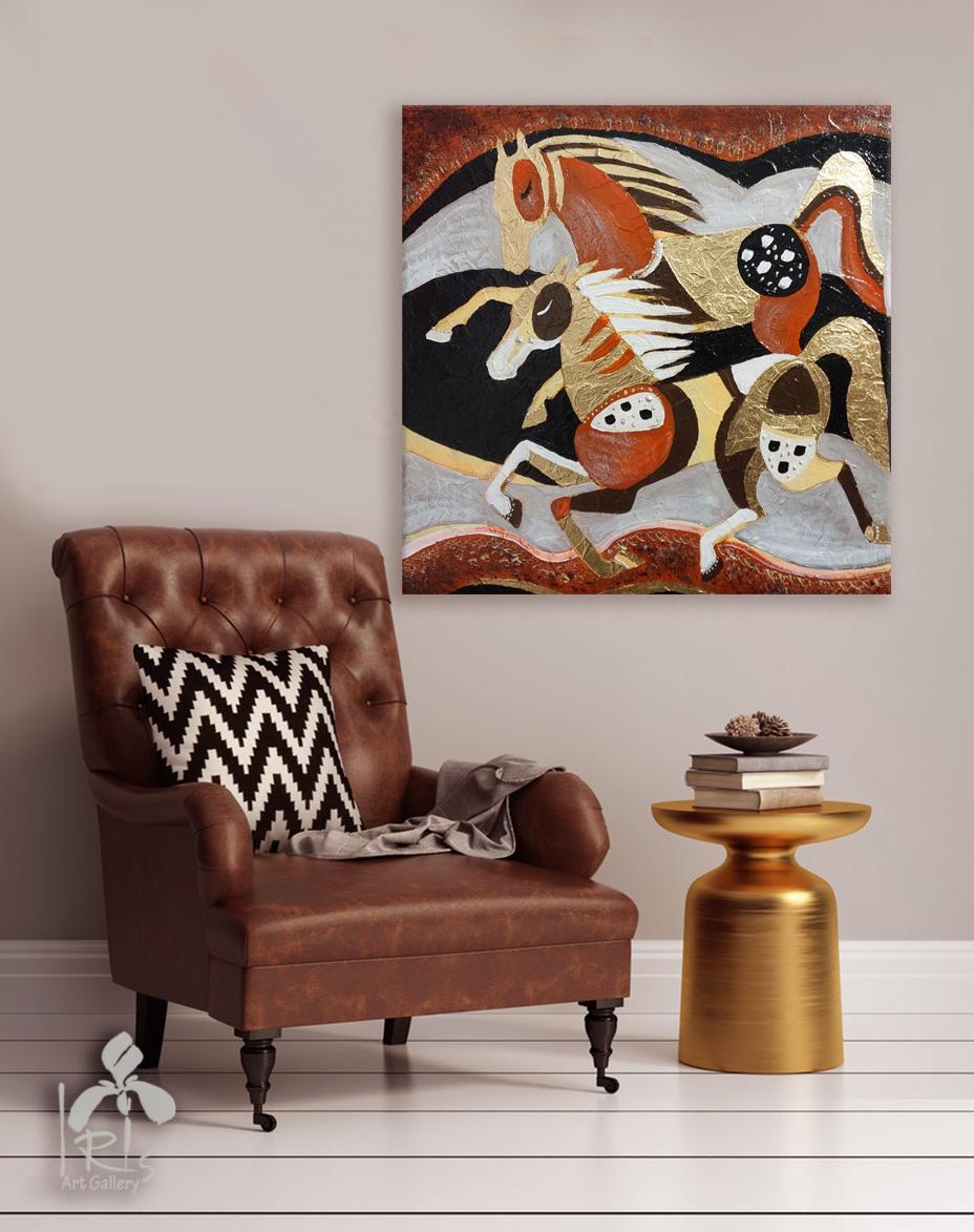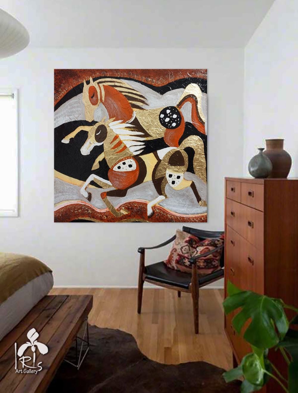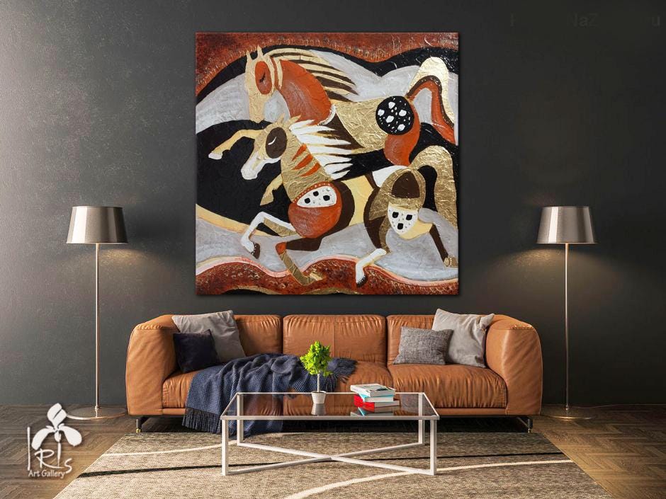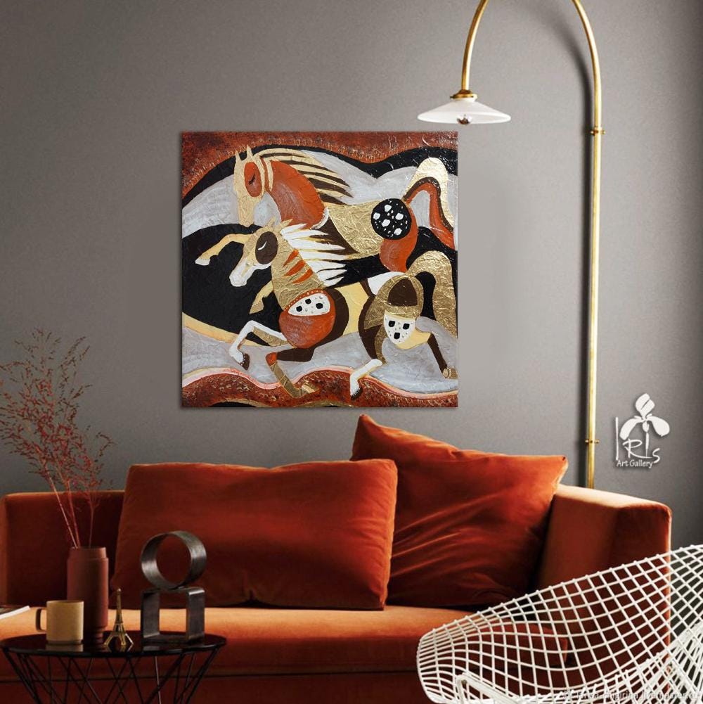 "Abstract Running Horses" is a modern, stylish, textured, original, and exquisite handmade painting, painted on natural canvas with high-quality oil and acrylic paints and gold leaf. The classic combination of gold, beige, brown, black, and white, along with the beautiful depiction of running horses, will make this painting a stylish and exclusive addition to your interior. It's perfect for a living room, bedroom, dining room, or hallway, and makes a wonderful gift for your family and friends for any occasion.