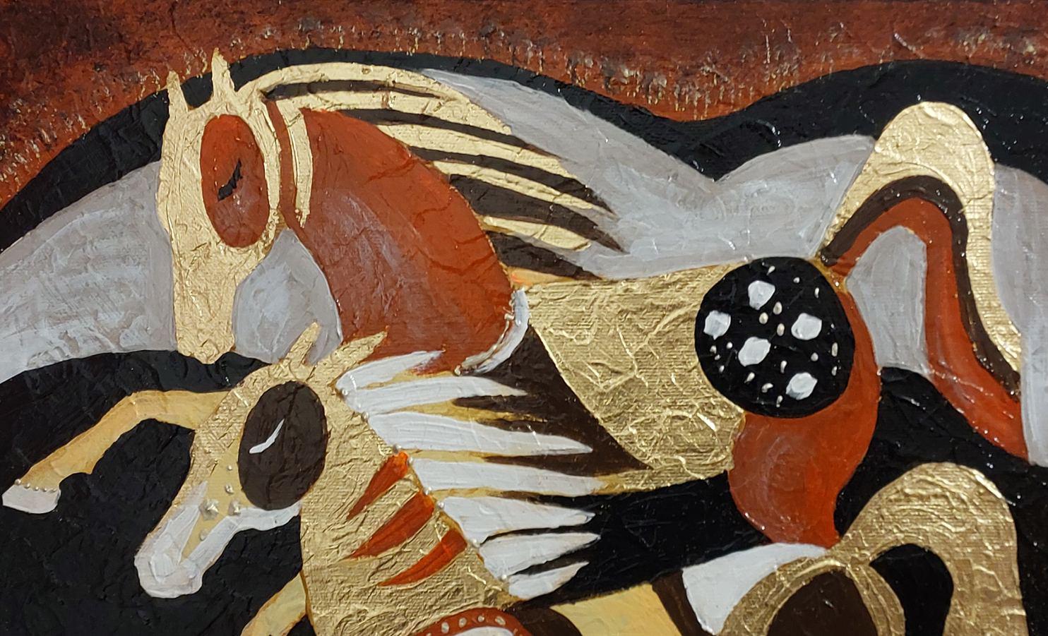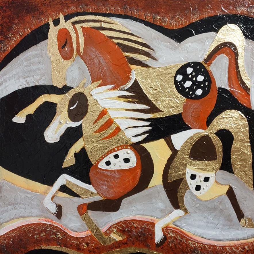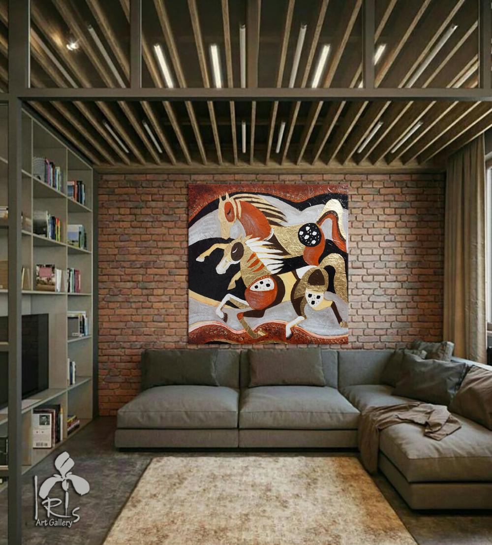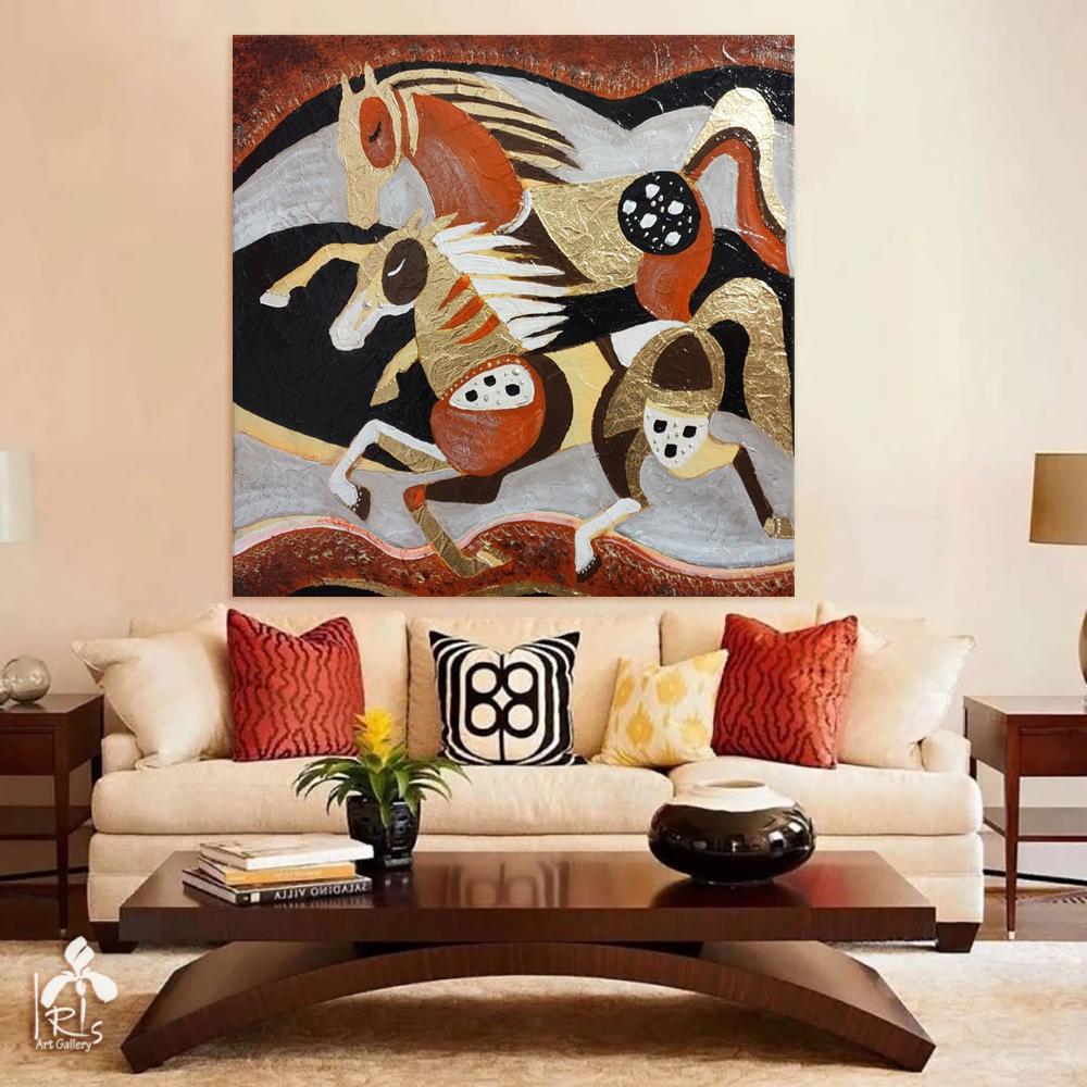 "Abstract Running Horses" is a modern, stylish, textured, original, and exquisite handmade painting, painted on natural canvas with high-quality oil and acrylic paints and gold leaf. The classic combination of gold, beige, brown, black, and white, along with the beautiful depiction of running horses, will make this painting a stylish and exclusive addition to your interior. It's perfect for a living room, bedroom, dining room, or hallway, and makes a wonderful gift for your family and friends for any occasion.