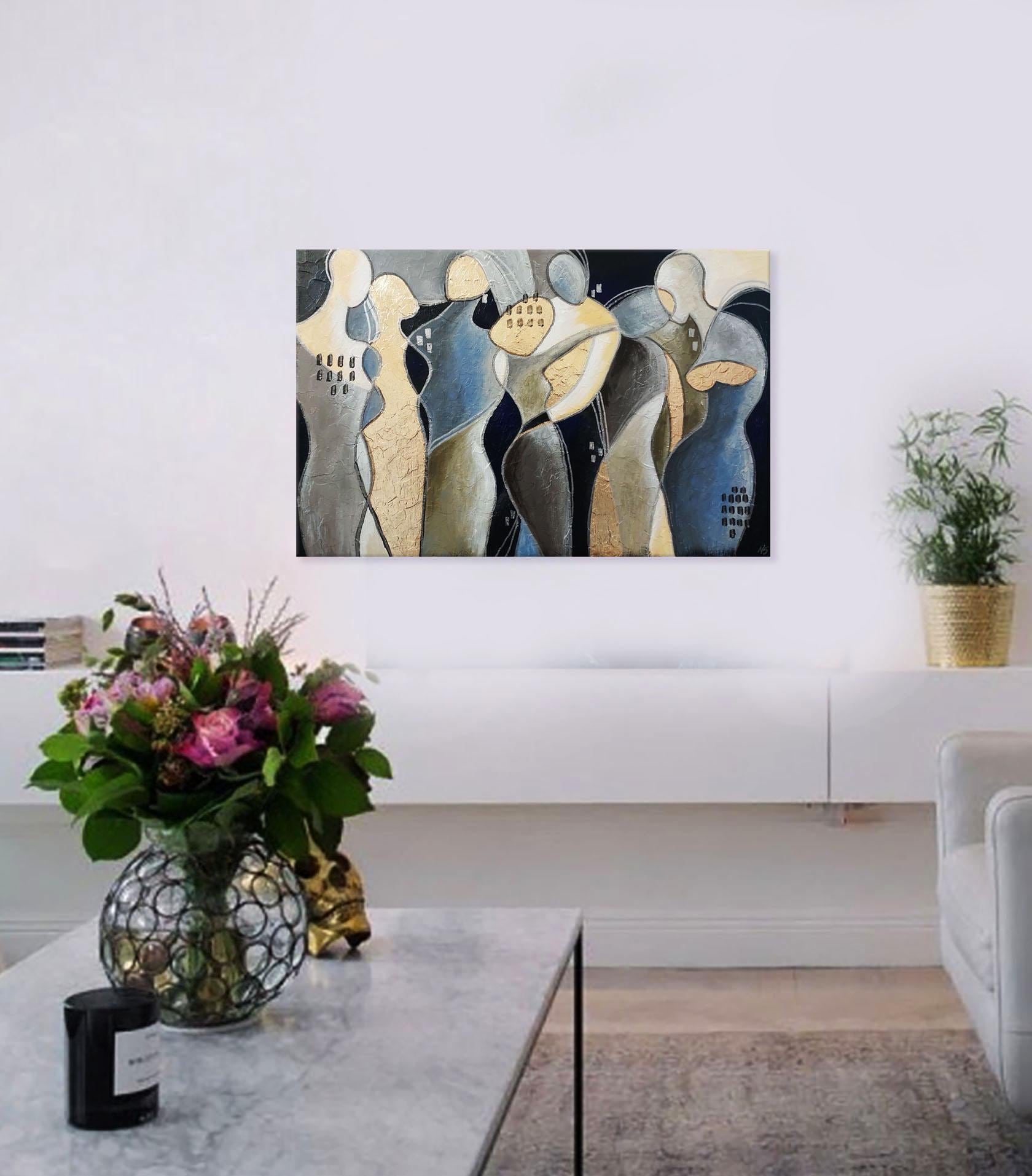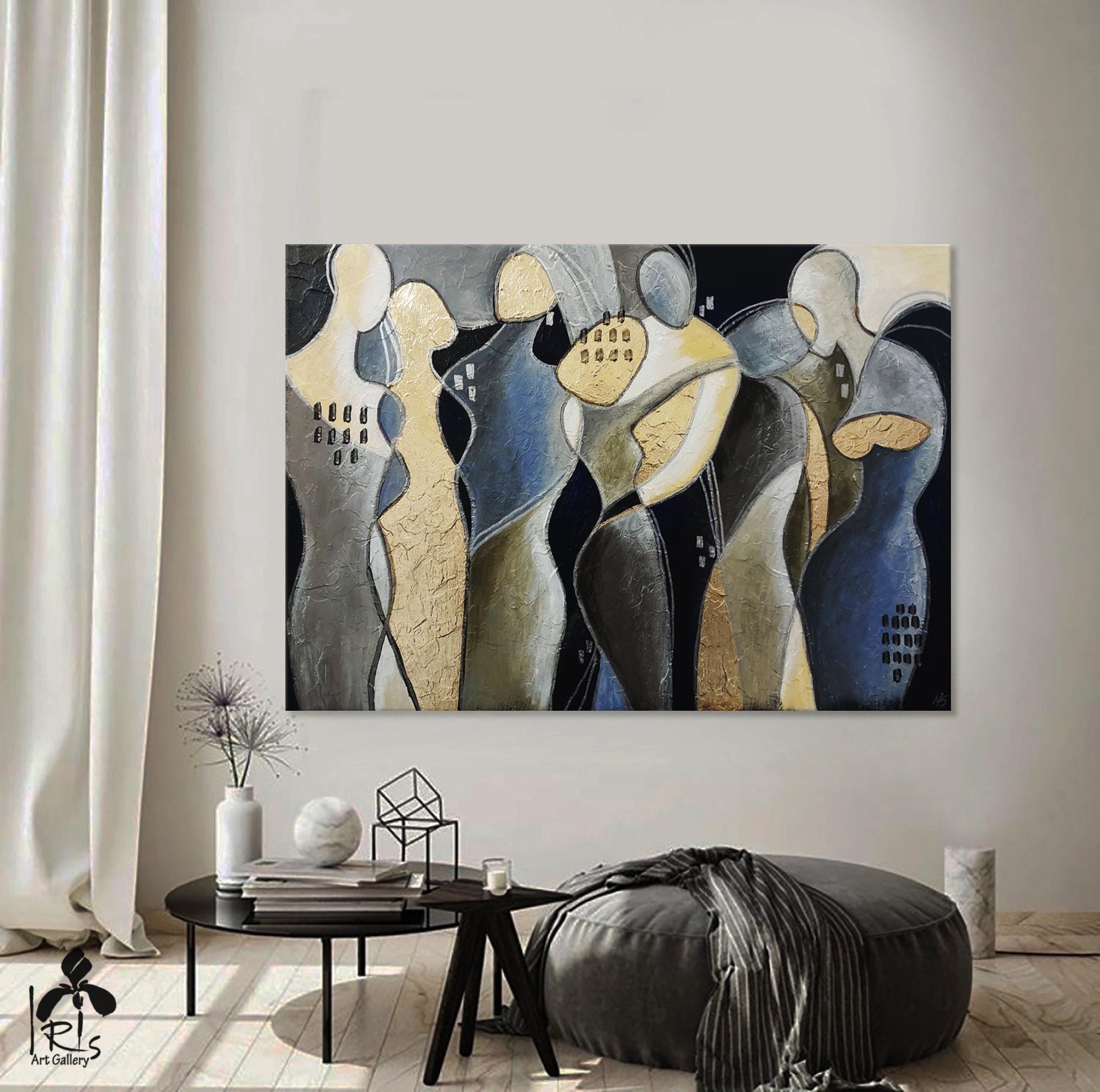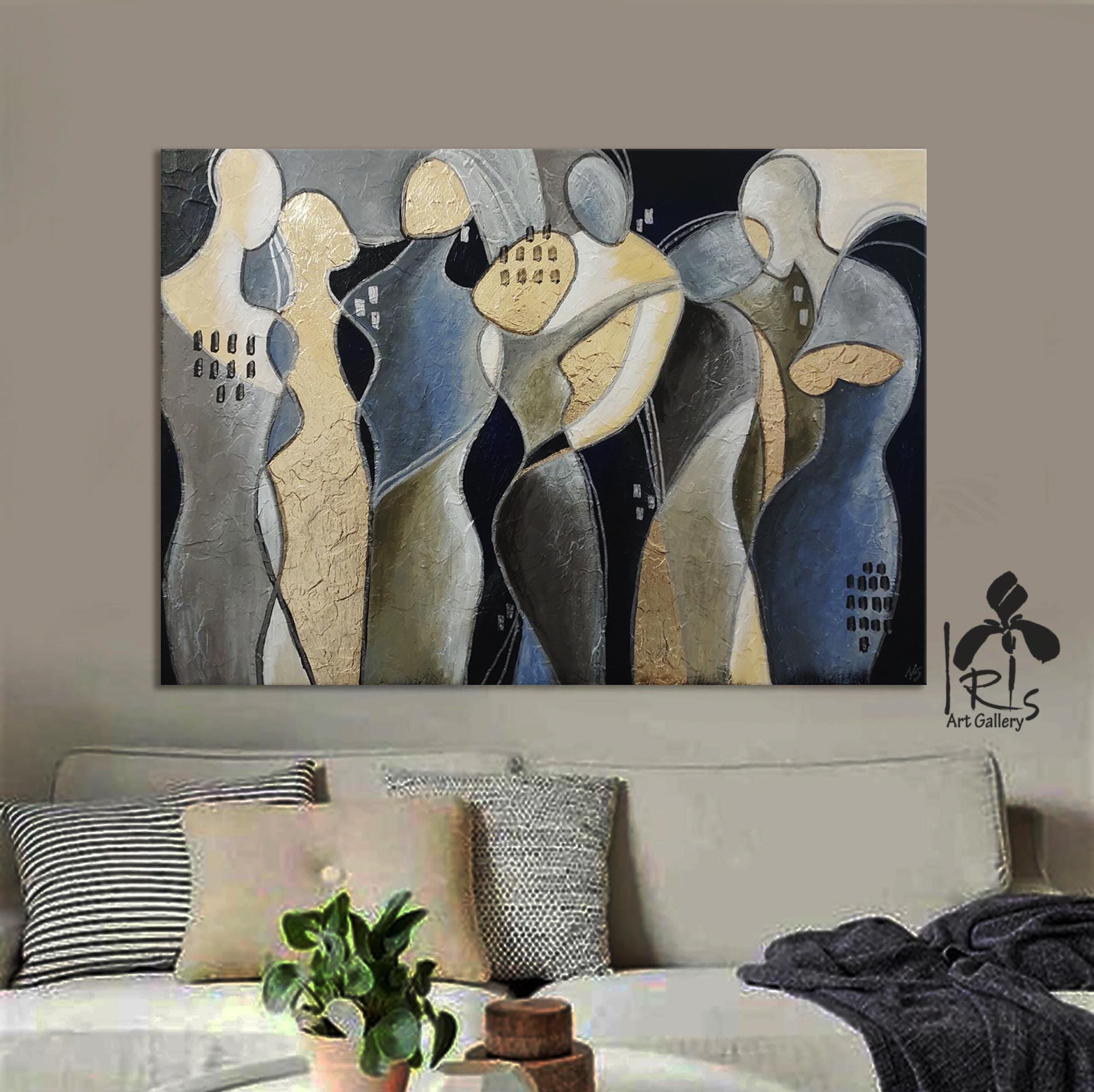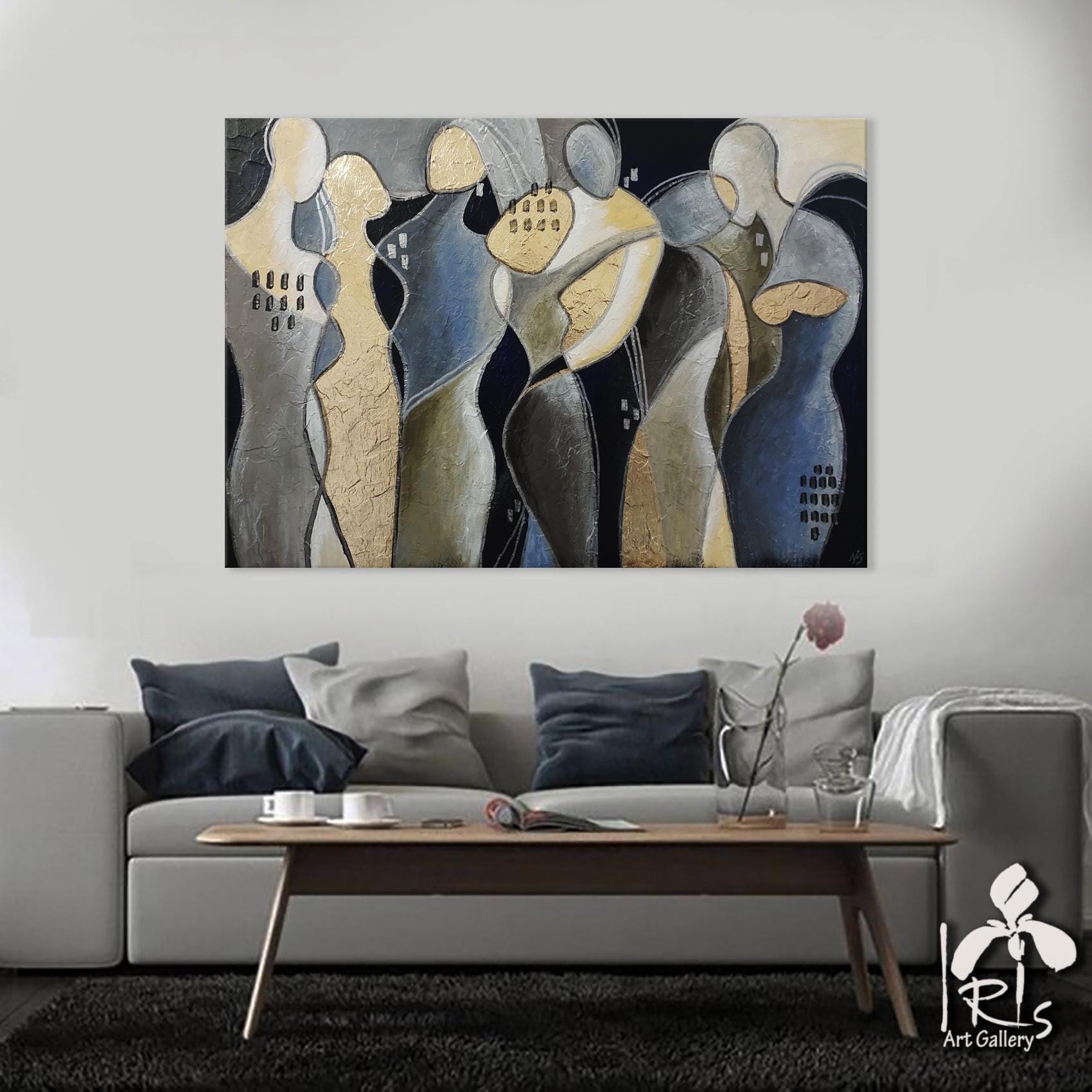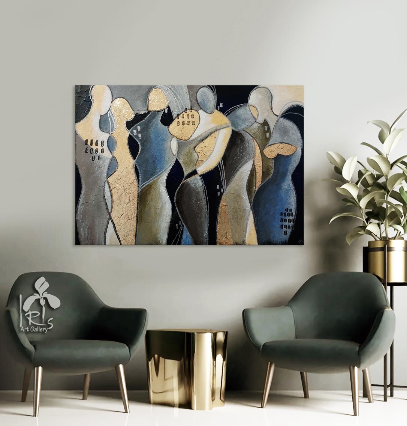 WHITE DANCE - Abstract Figurative Painting is an original, highly textured, abstract, and very stylish painting, painted on natural canvas with professional, high-quality oil and acrylic paints in an abstract, minimalist style. This modern and stylish painting in classic black, gold, gray, and blue tones will make a wonderful addition to your interior, captivating the eye and evoking joyful, positive emotions. It depicts modern silhouettes of people dancing. This painting will fill your interior with a joyful mood! You can give it to your family, friends, and loved ones for any occasion. It will be a wonderful gift!