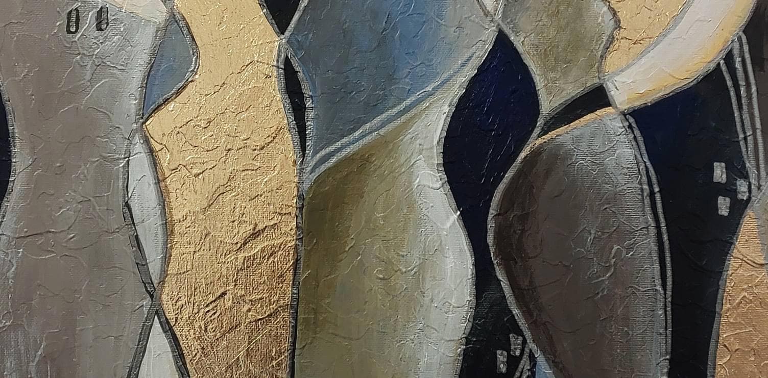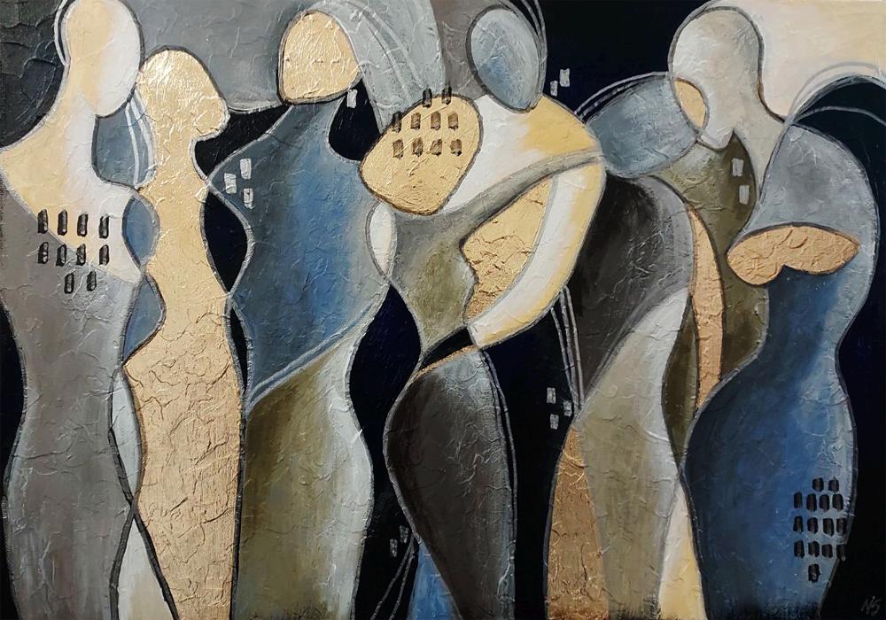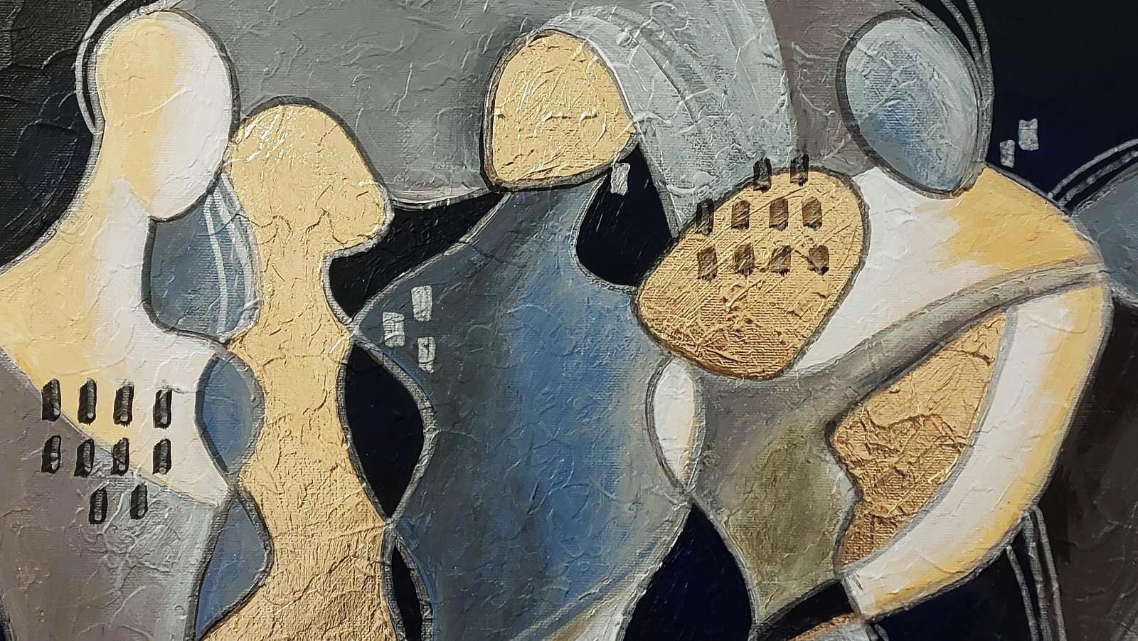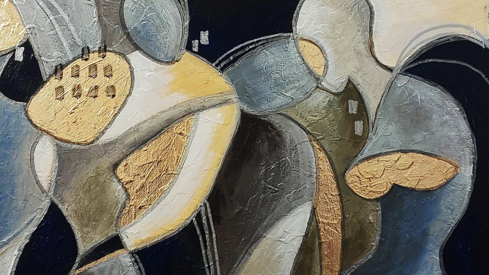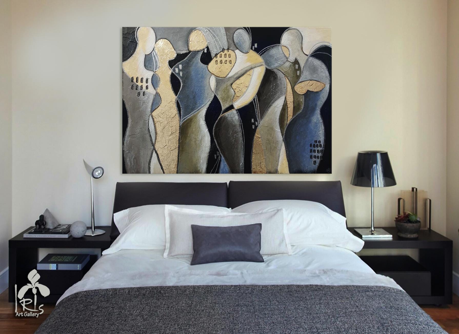 WHITE DANCE - Abstract Figurative Painting is an original, highly textured, abstract, and very stylish painting, painted on natural canvas with professional, high-quality oil and acrylic paints in an abstract, minimalist style. This modern and stylish painting in classic black, gold, gray, and blue tones will make a wonderful addition to your interior, captivating the eye and evoking joyful, positive emotions. It depicts modern silhouettes of people dancing. This painting will fill your interior with a joyful mood! You can give it to your family, friends, and loved ones for any occasion. It will be a wonderful gift!