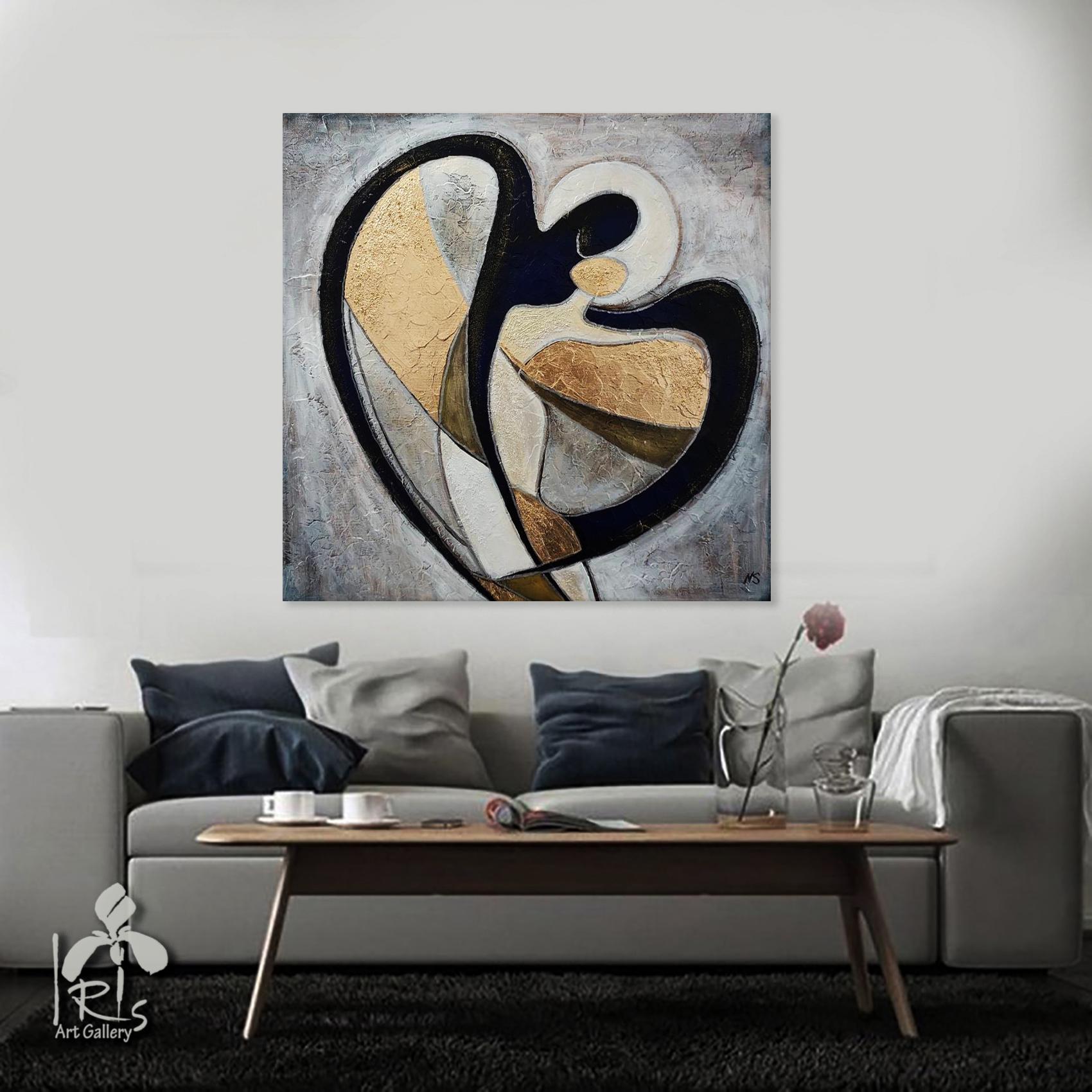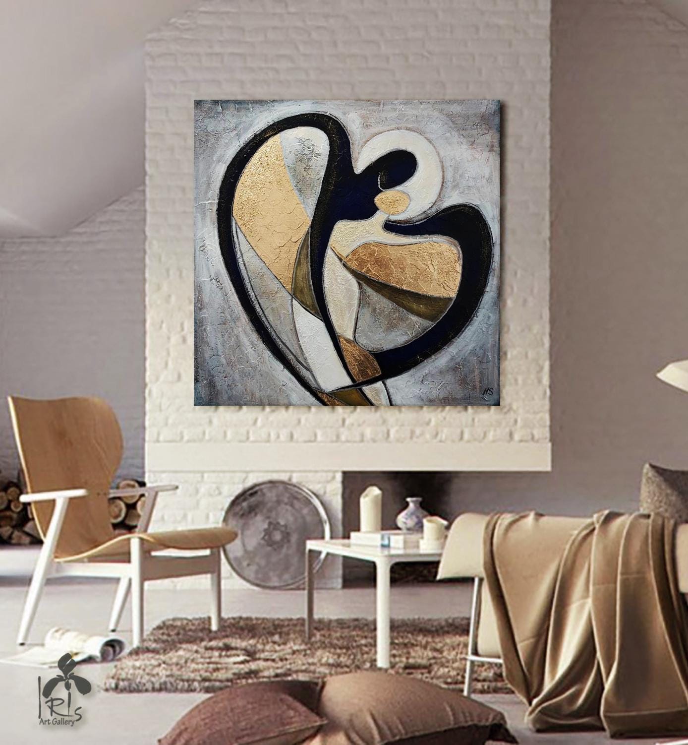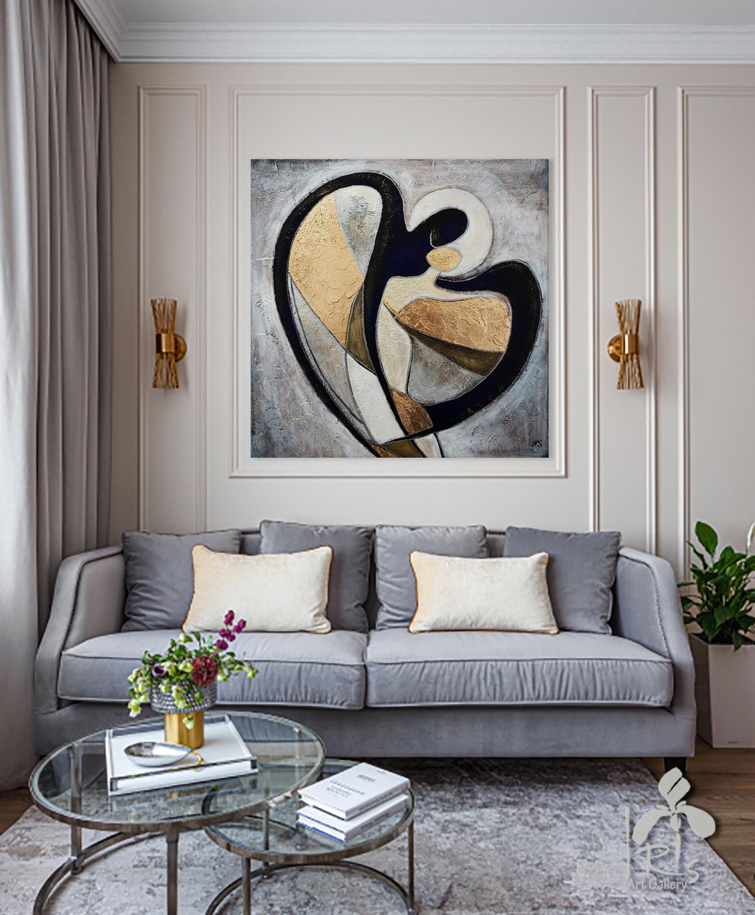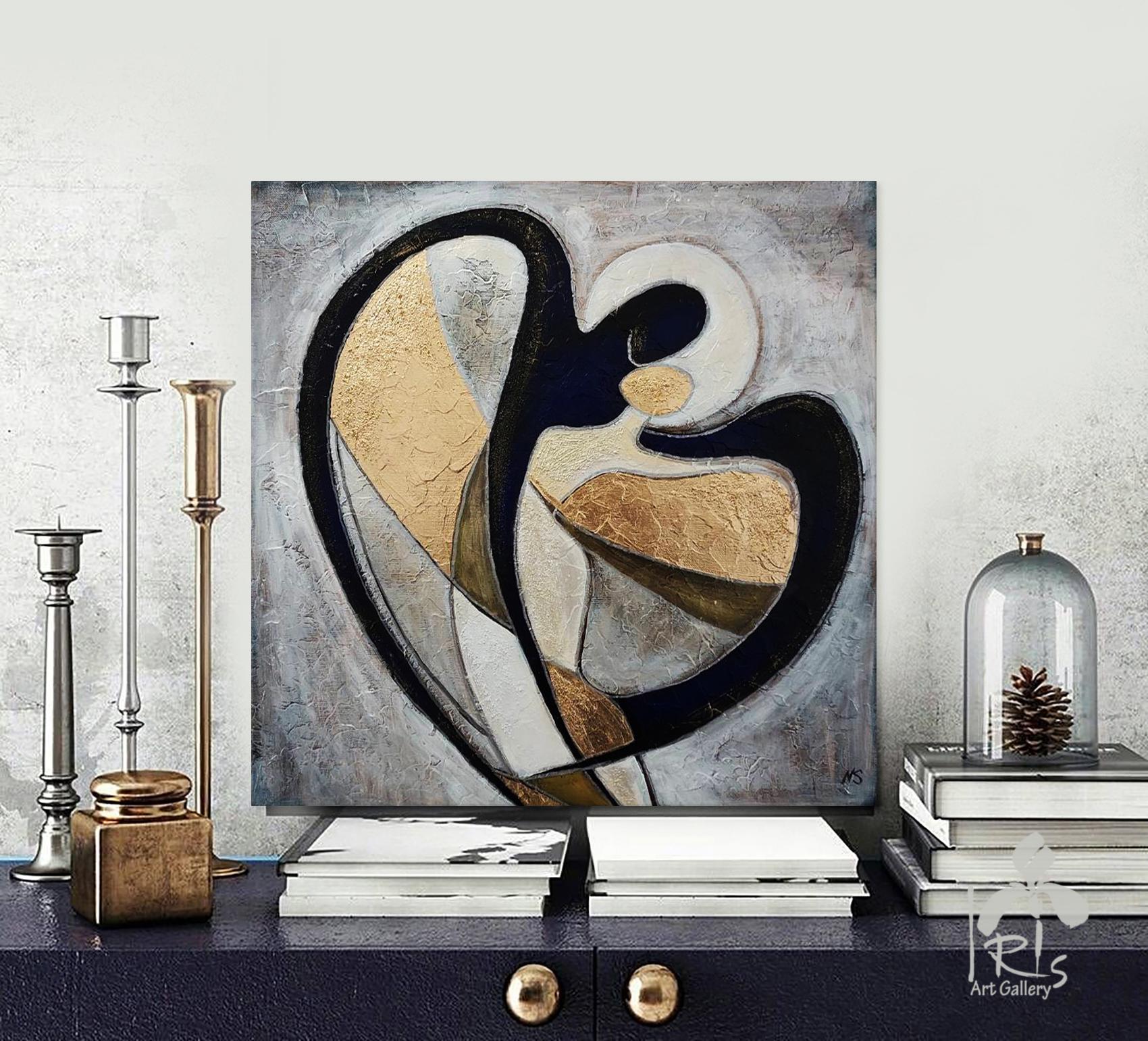 Couple in Love. This original, textured, modern, abstract, and very stylish painting of a couple in love is hand-painted on natural canvas using high-quality oil and acrylic paints and gold leaf. The combination of various shades of beige and gray and abstract images of lovers makes this painting a stylish, exclusive addition to your interior. The velvety texture of the painting perfectly highlights the original subject matter.