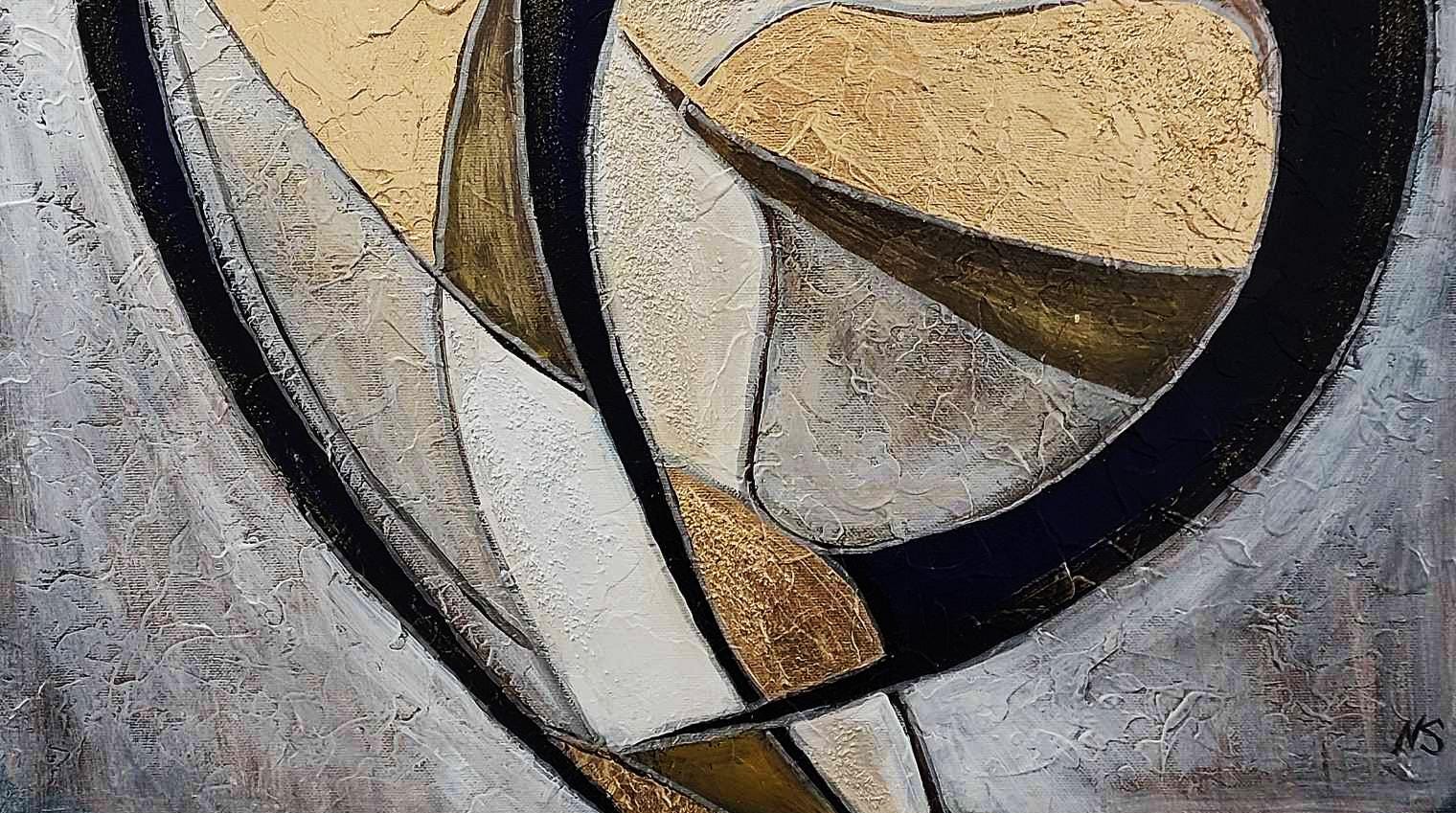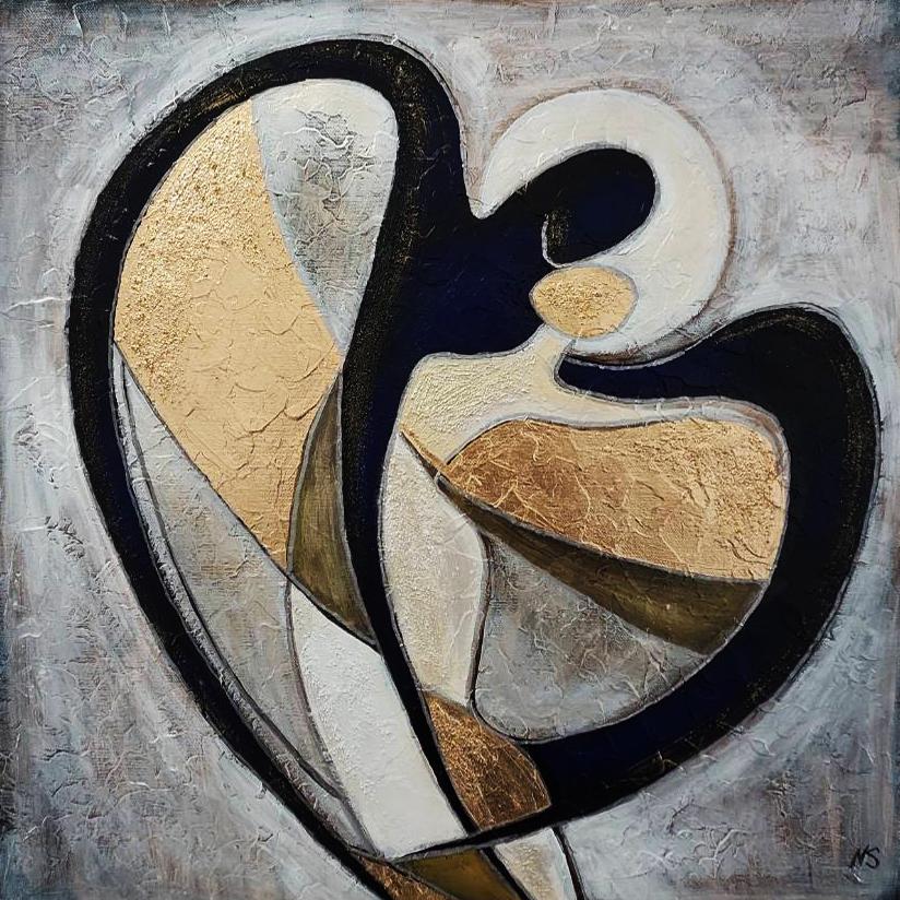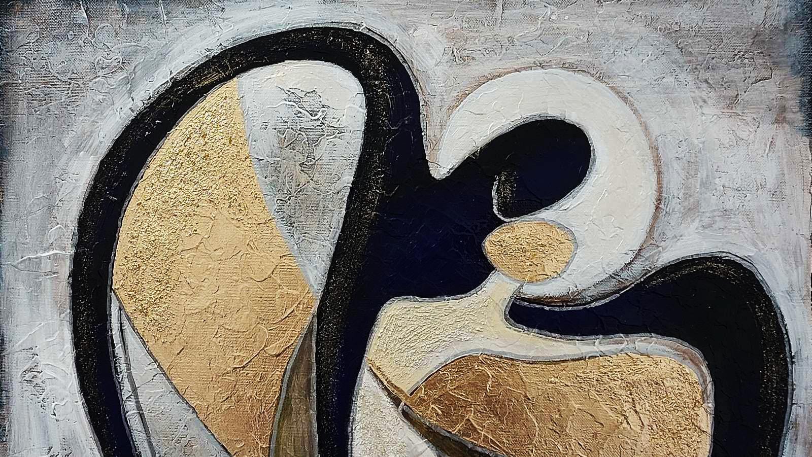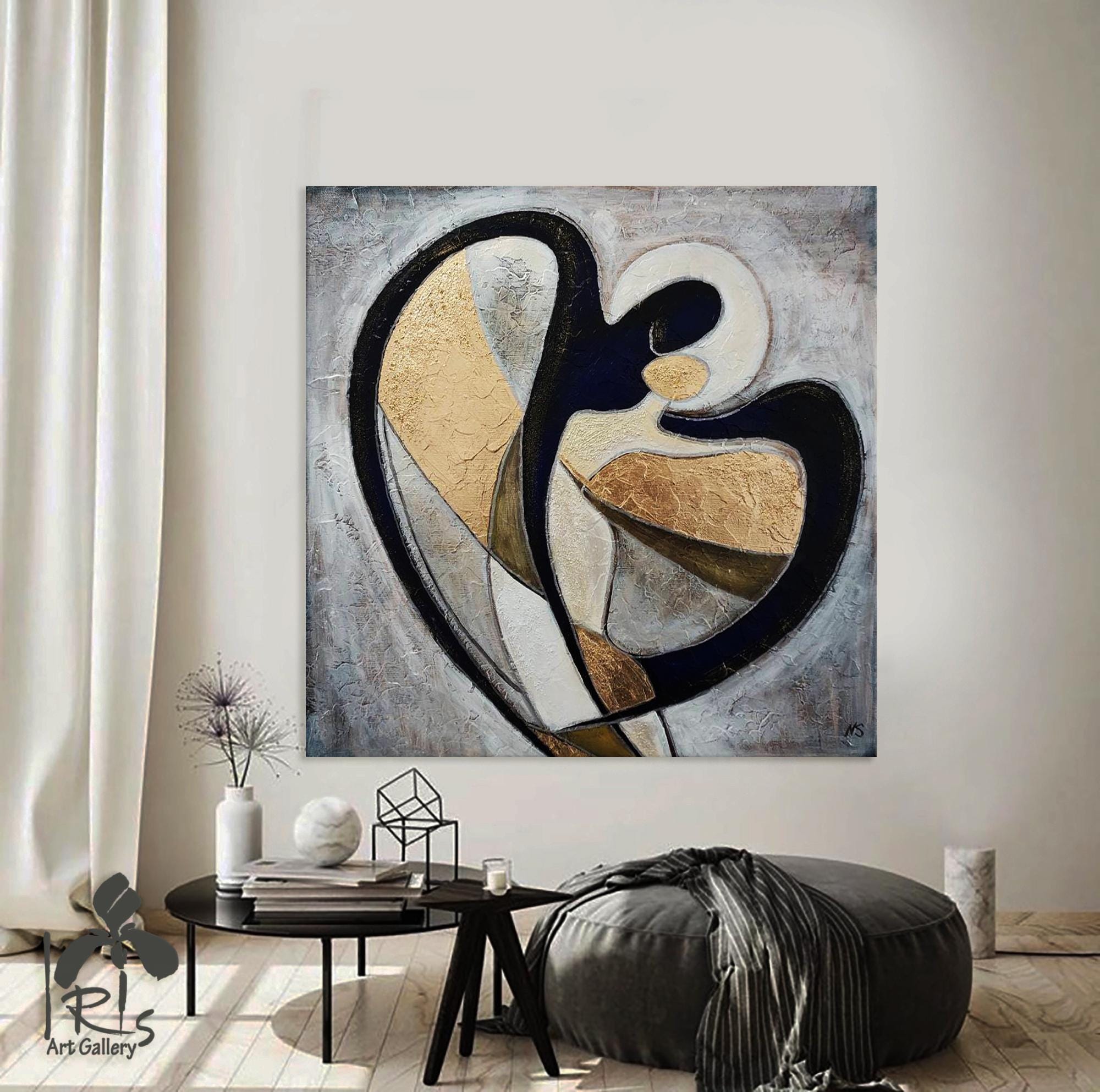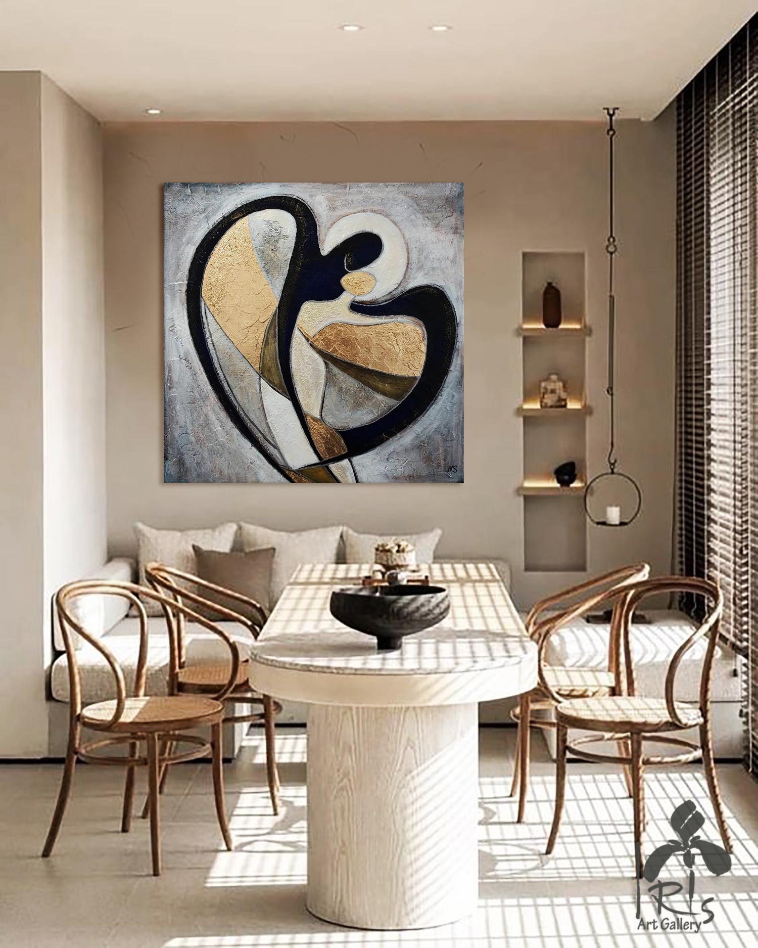 Couple in Love. This original, textured, modern, abstract, and very stylish painting of a couple in love is hand-painted on natural canvas using high-quality oil and acrylic paints and gold leaf. The combination of various shades of beige and gray and abstract images of lovers makes this painting a stylish, exclusive addition to your interior. The velvety texture of the painting perfectly highlights the original subject matter.